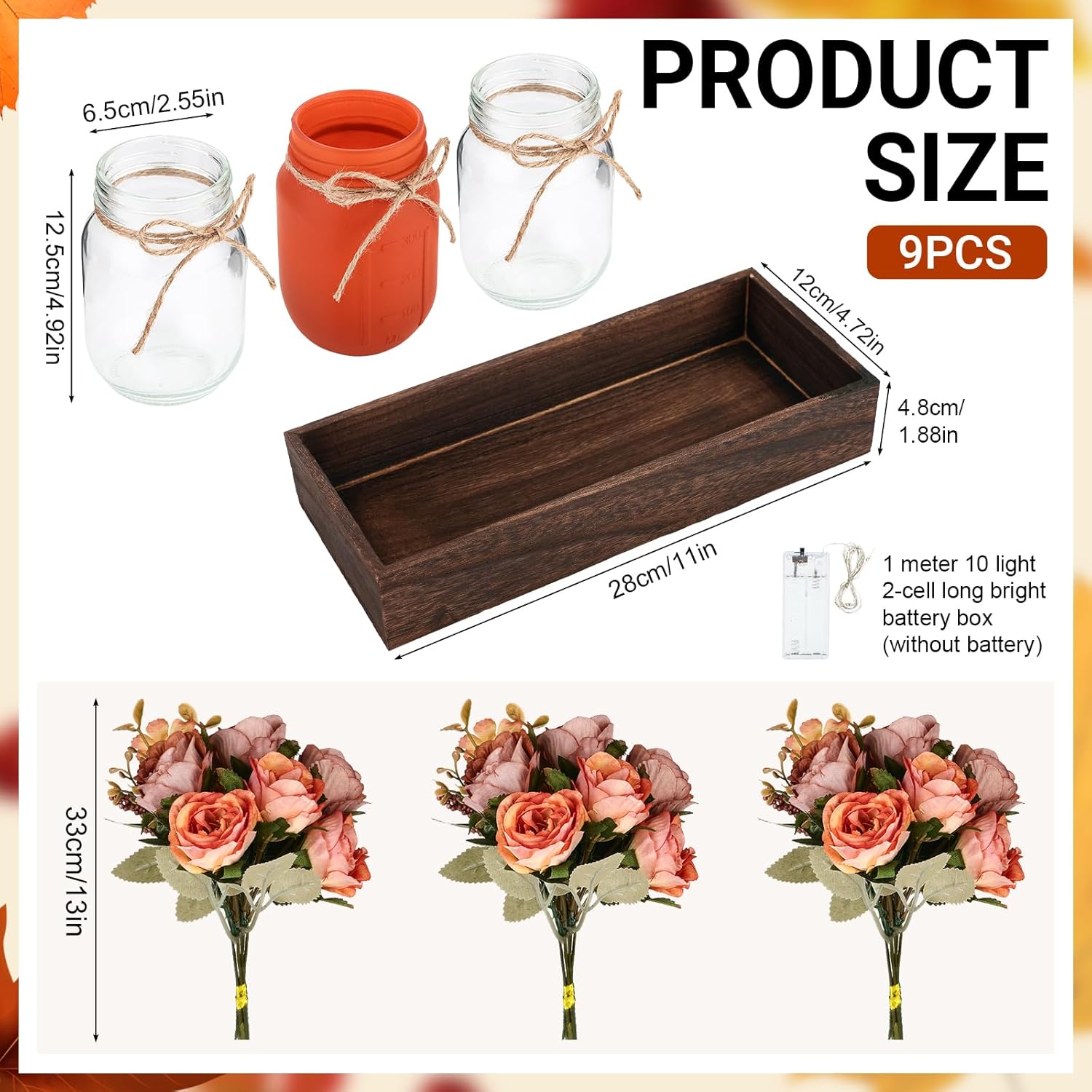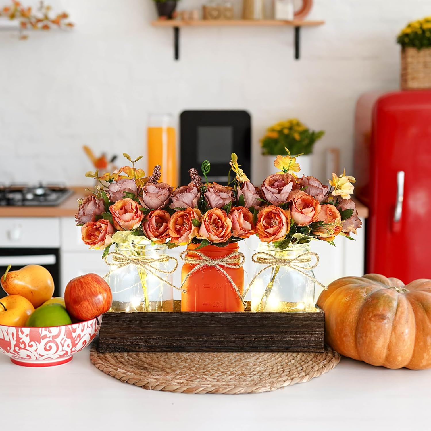 - Fall Decorations for Home: Our fall decor set includes three mason jars (two clear, one orange), three artificial flowers, two string lights, and a wooden tray filled with realistic artificial flowers, creating a warm and cozy autumn atmosphere for your home, dining room, or kitchen.