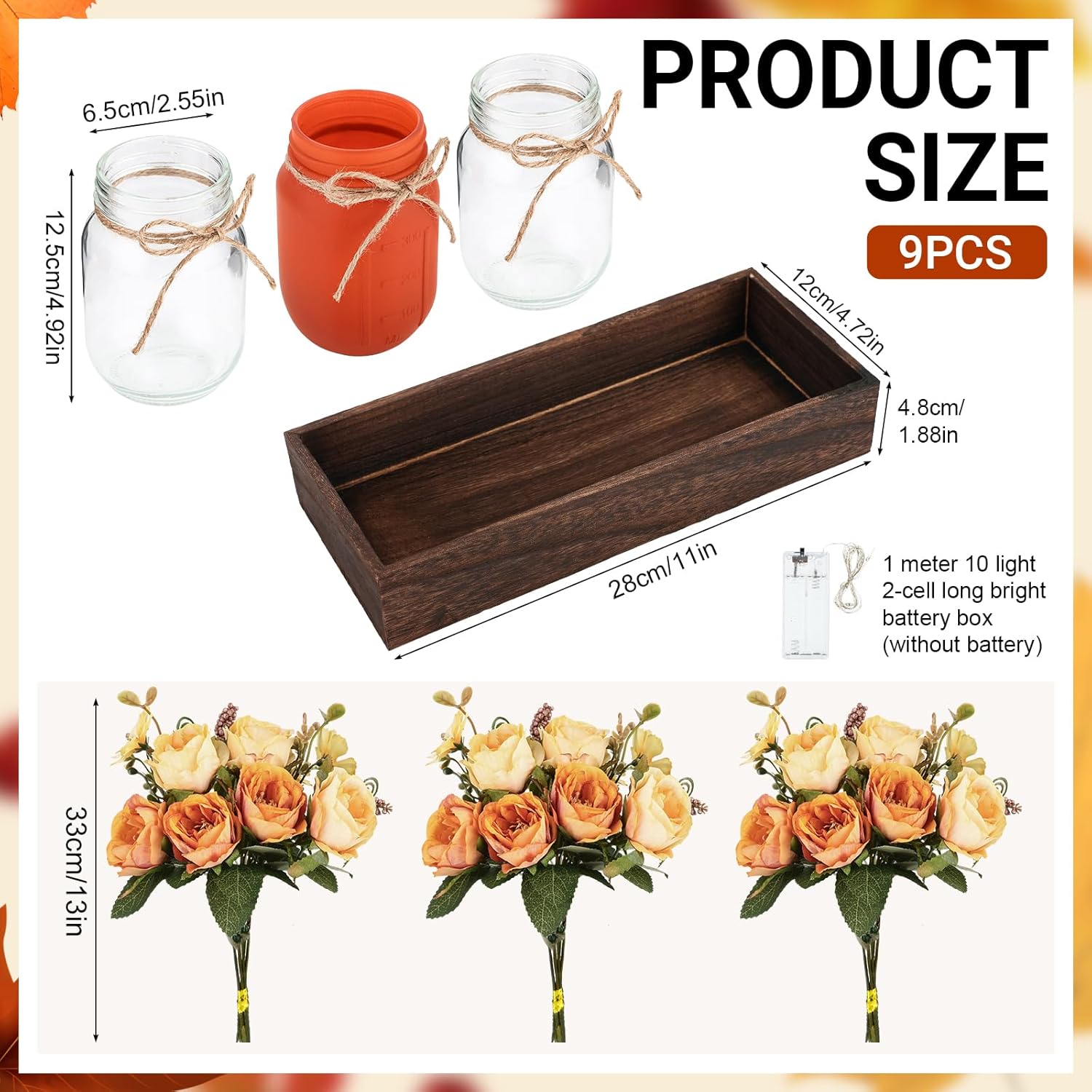 - Complete Fall Table Centerpiece Set: Includes 3 mason jars (2 clear and 1 orange), with rustic hemp rope bows, 3 bundles of artificial roses (11 inch high, 6 flowers per bundle), 2 warm white 40 inch string lights, and a sturdy wooden tray—everything you need for a charming fall display.