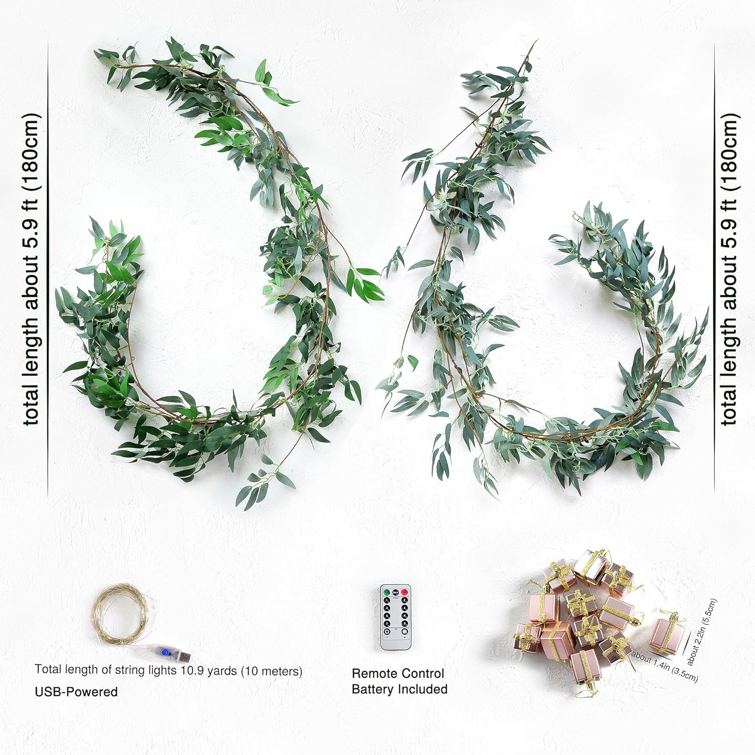 Artificial Willow Garland with USB Fairy String Lights & Pink Gift Box Ornaments – 2-Pack Lighted Greenery Vine, with Remote for Mantels, Weddings, Fireplace, Holidays, Parties & Everyday Home Decor