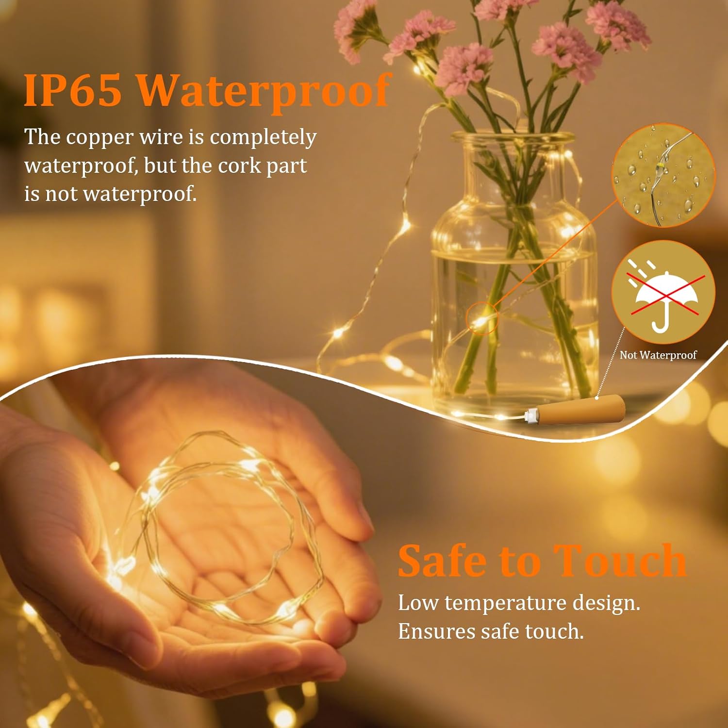 - Flexible Copper Wire Lights for DIY Application: Each fairy light features 6.6 ft of premium copper wire with 20 mini LEDs. You can bend and shape them to easily decorate bottles, crafts, plants, furniture, or balcony railings. And the IP65 waterproof design lets you get creative: you can submerge the cork fairy lights to create amazing underwater effects (just make sure the cork stays dry) and make every project glow beautifully