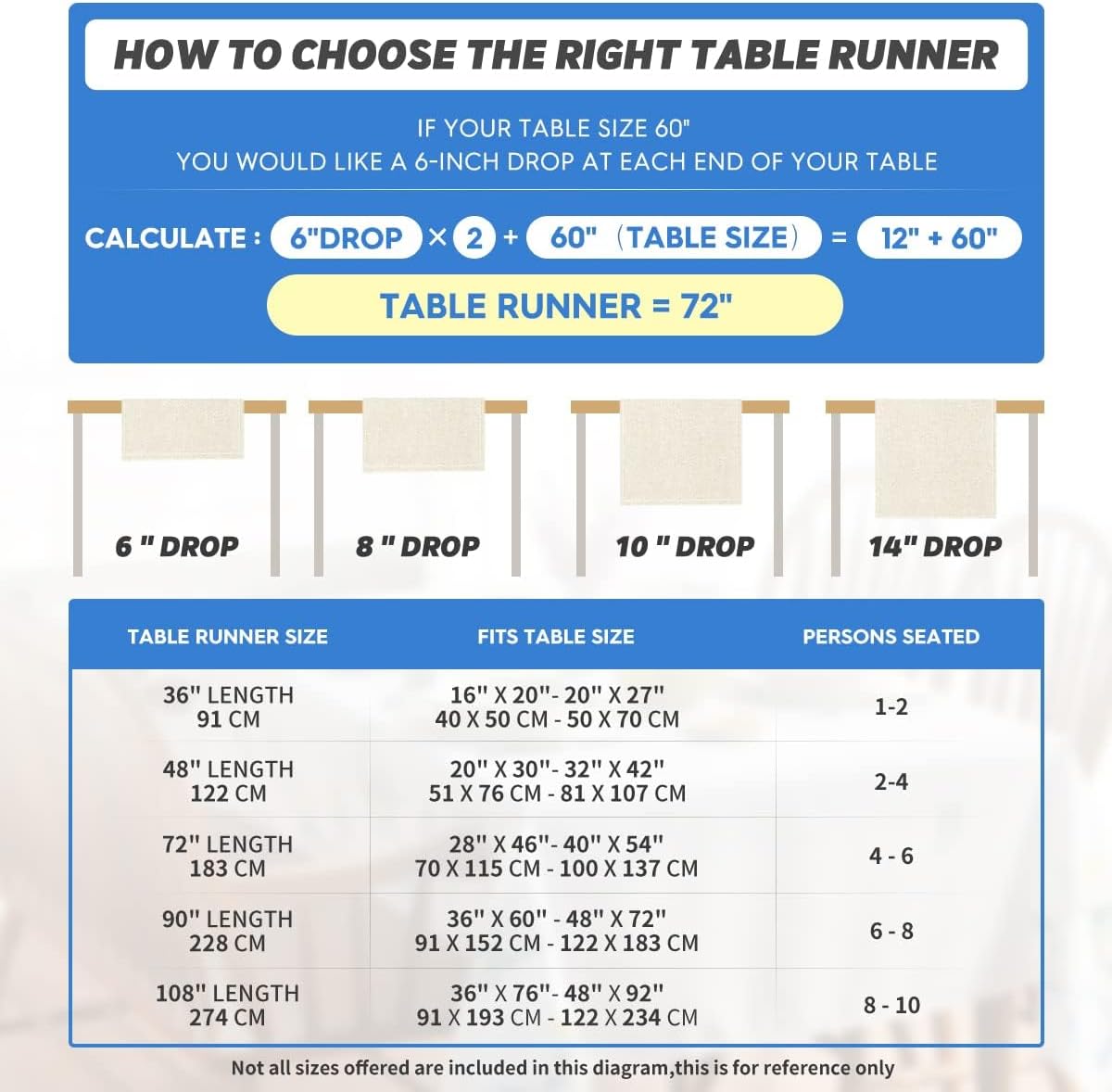 - Fits Table Size : This table runner is 13 x 36 inch, appropriate for a table that can seat 1-2 people, better match your table and give you a delightful dining experience
