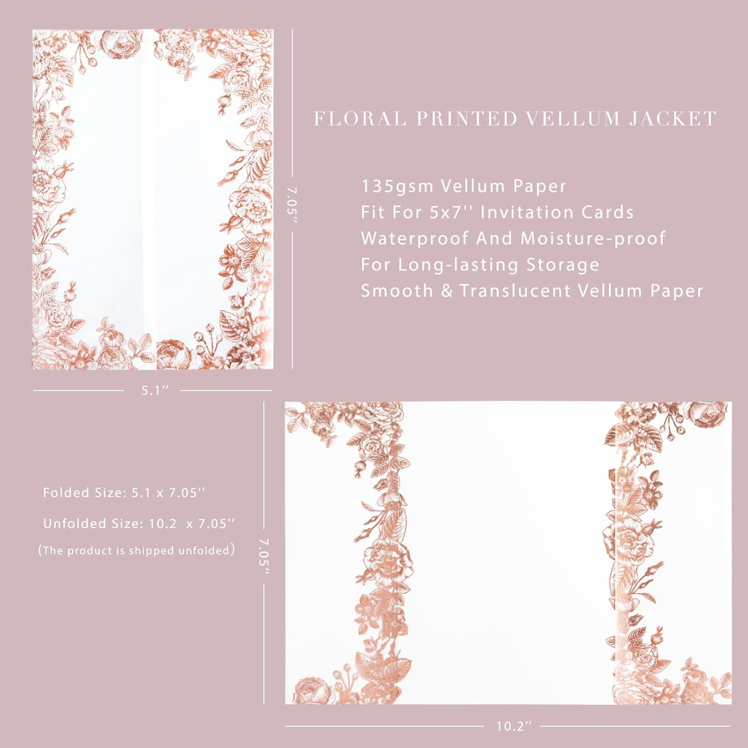 PONATIA 50 PCS Vellum Jackets for 5x7 Wedding Invitation Cards- 135gsm Floral Printed Vellum Sleeves, Invitation Cards Wraps (Rose Gold Foil)