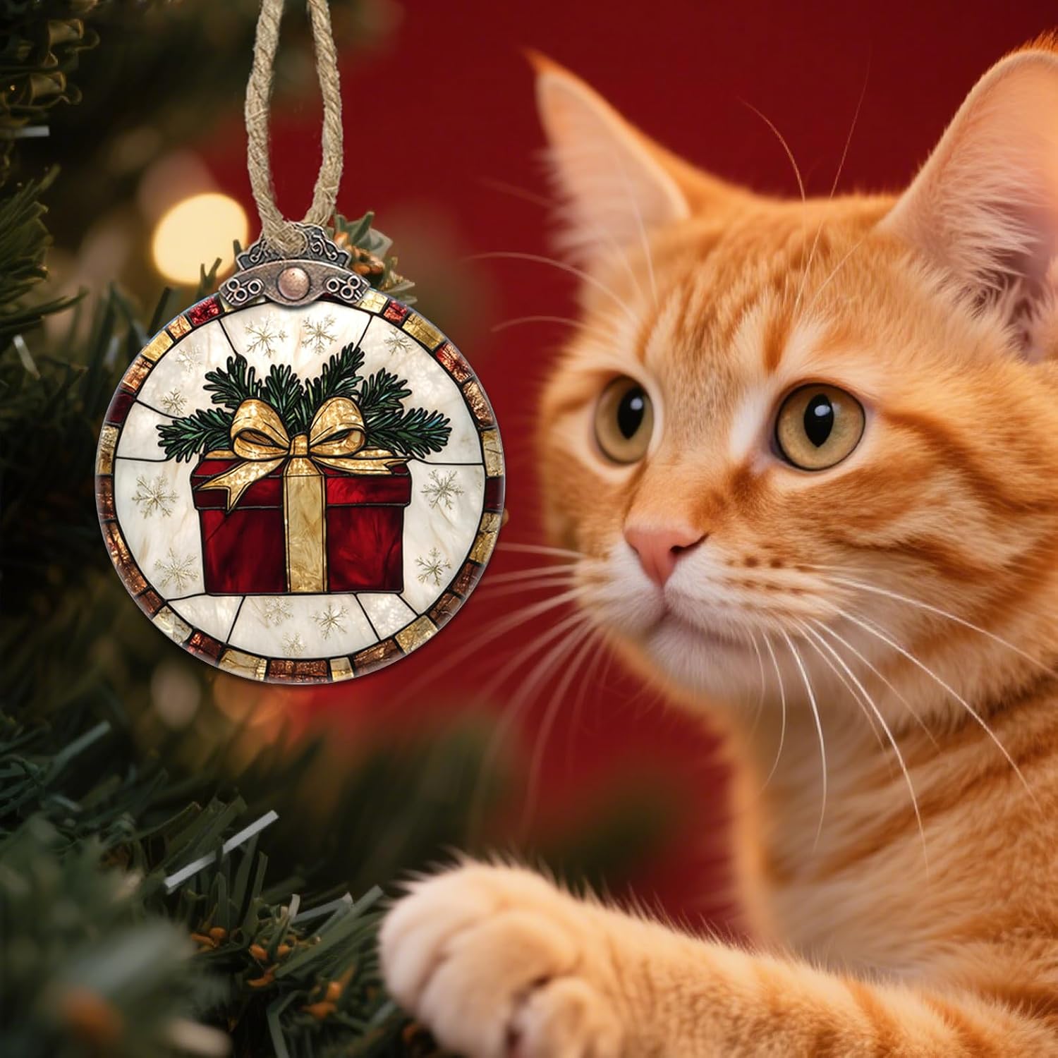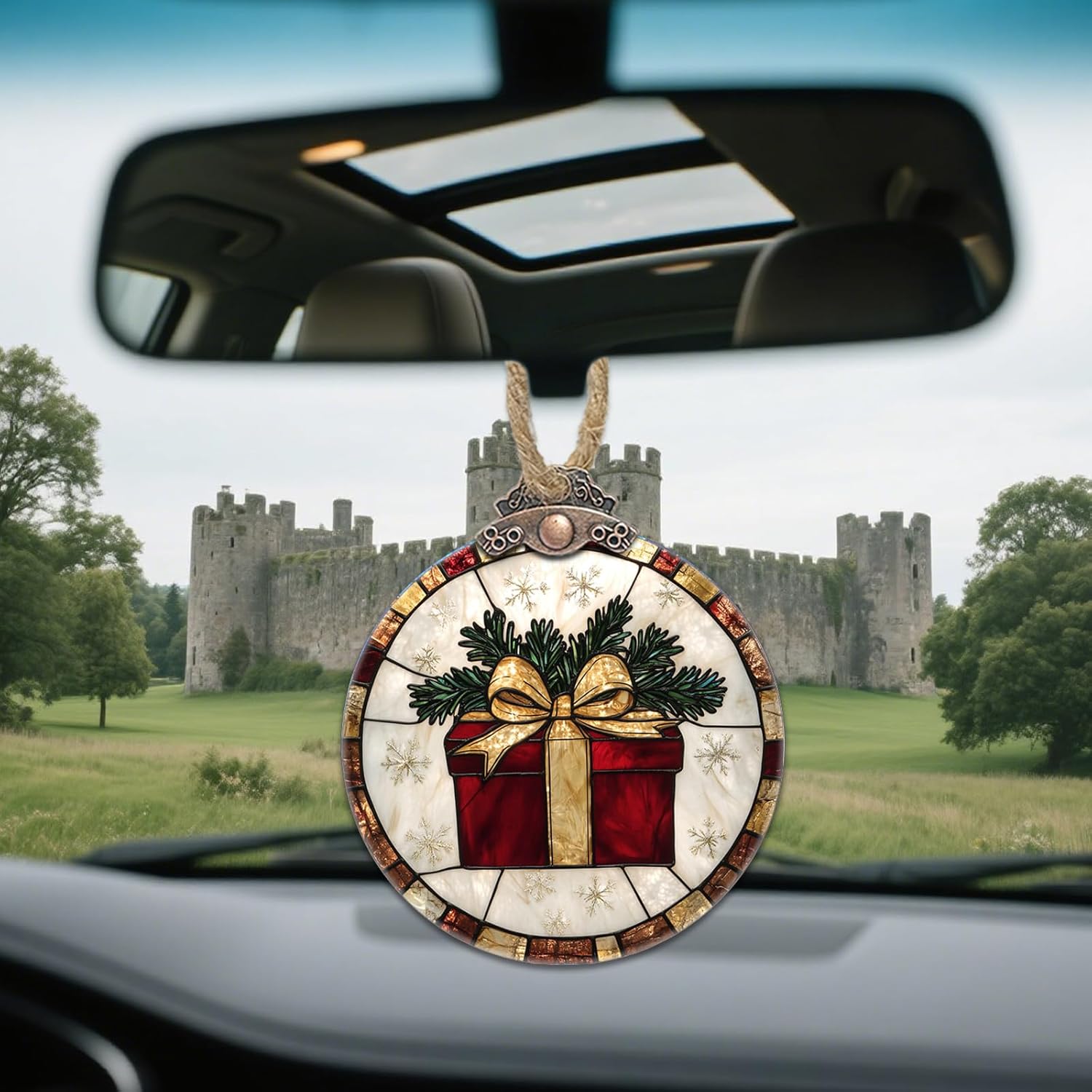 Stained Glass Christmas Decorations, Red Gift with Gold Ribbon Suncatcher for Window Christmas Tree Hanging Ornaments Retro White Sun Catcher Xmas Decor Gifts for Women Men Mom Nana Friend