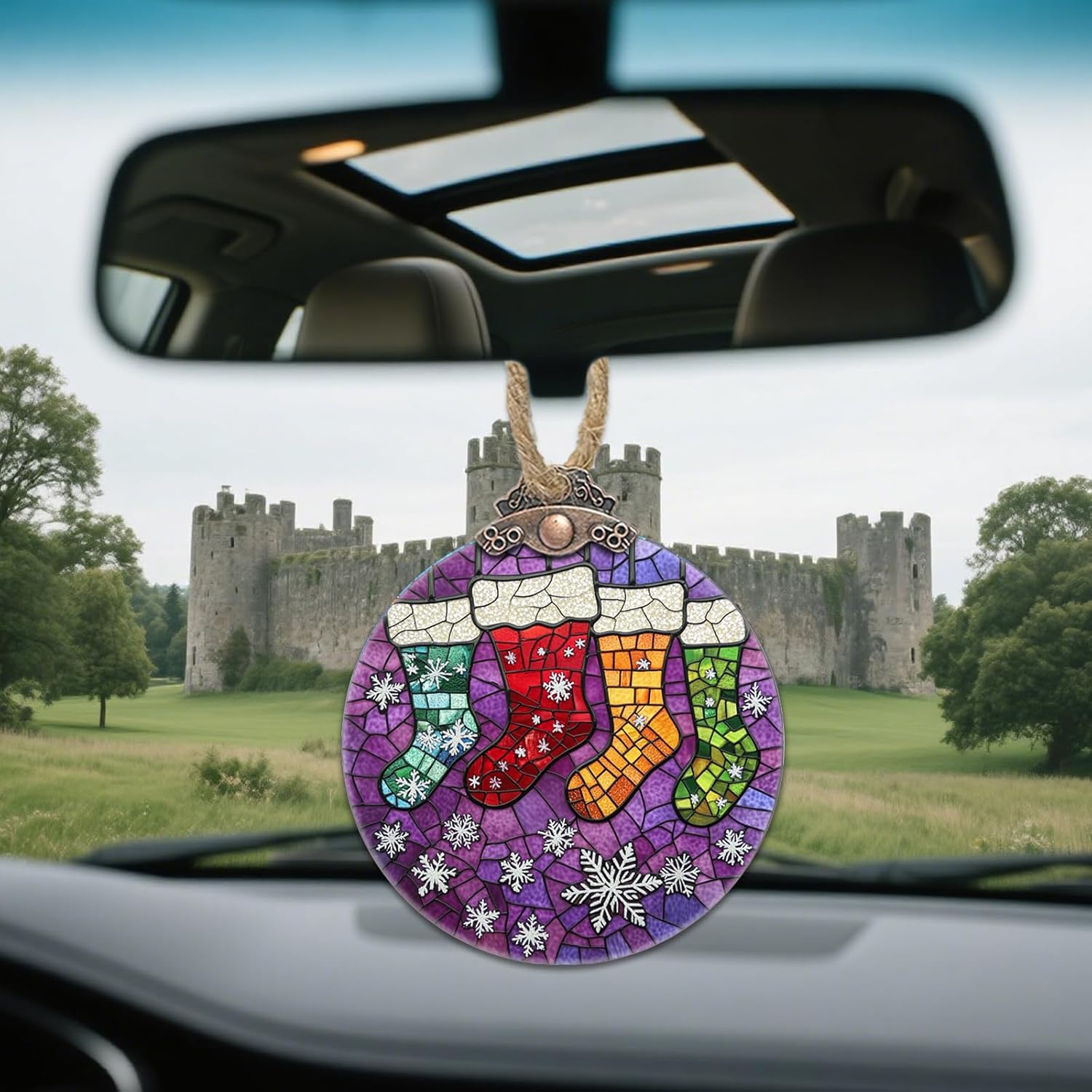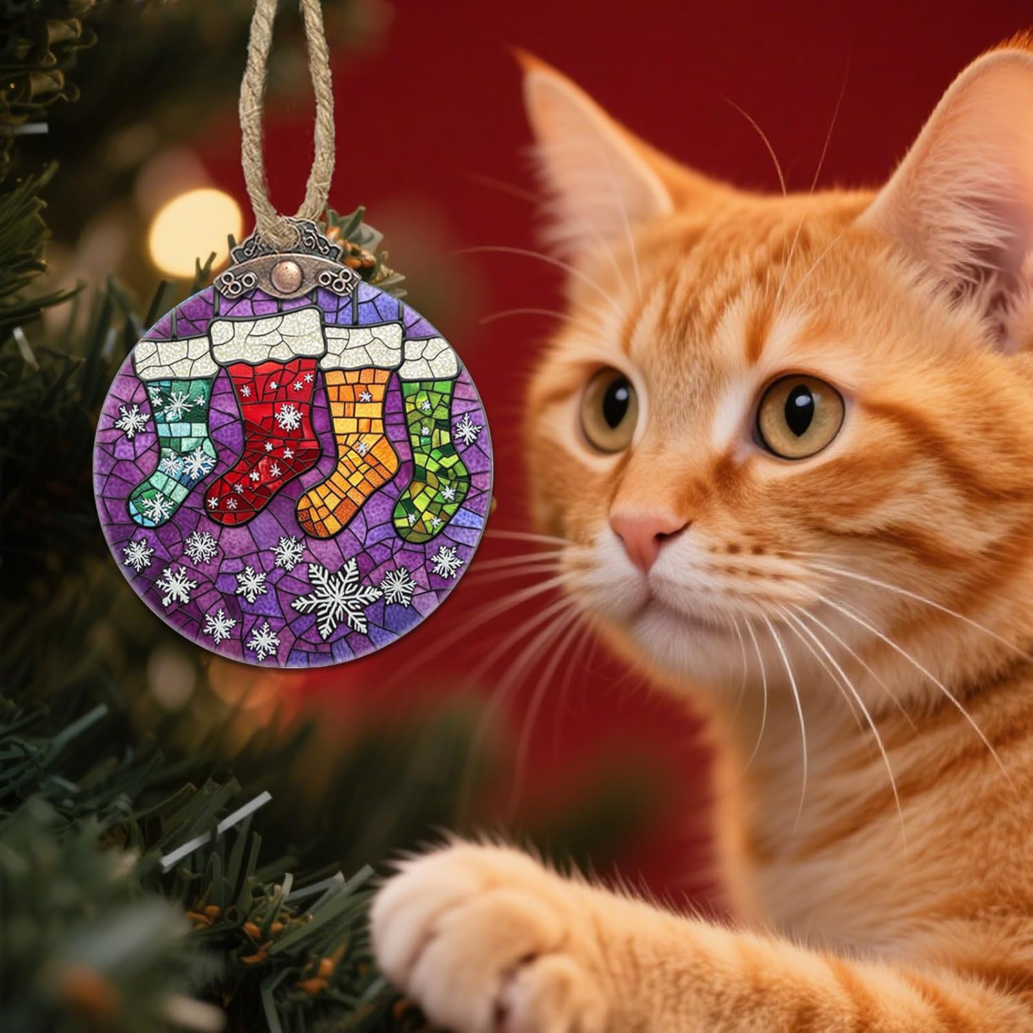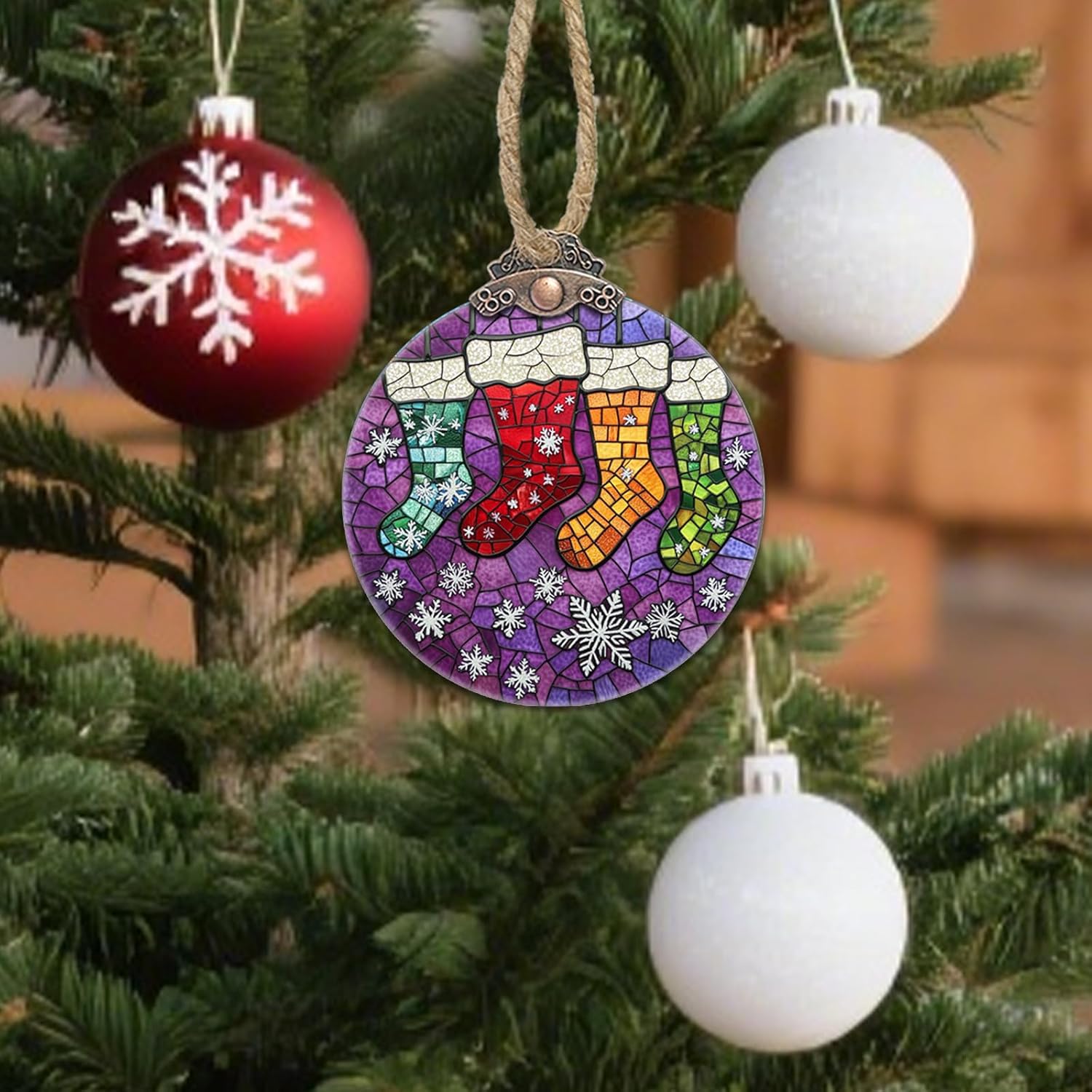 Stained Glass Christmas Decorations, Colorful Stockings Purple Suncatcher for Window Christmas Tree Hanging Ornaments Snowflake Sun Catcher Xmas Decor Gifts for Women Men Mom Nana Friend