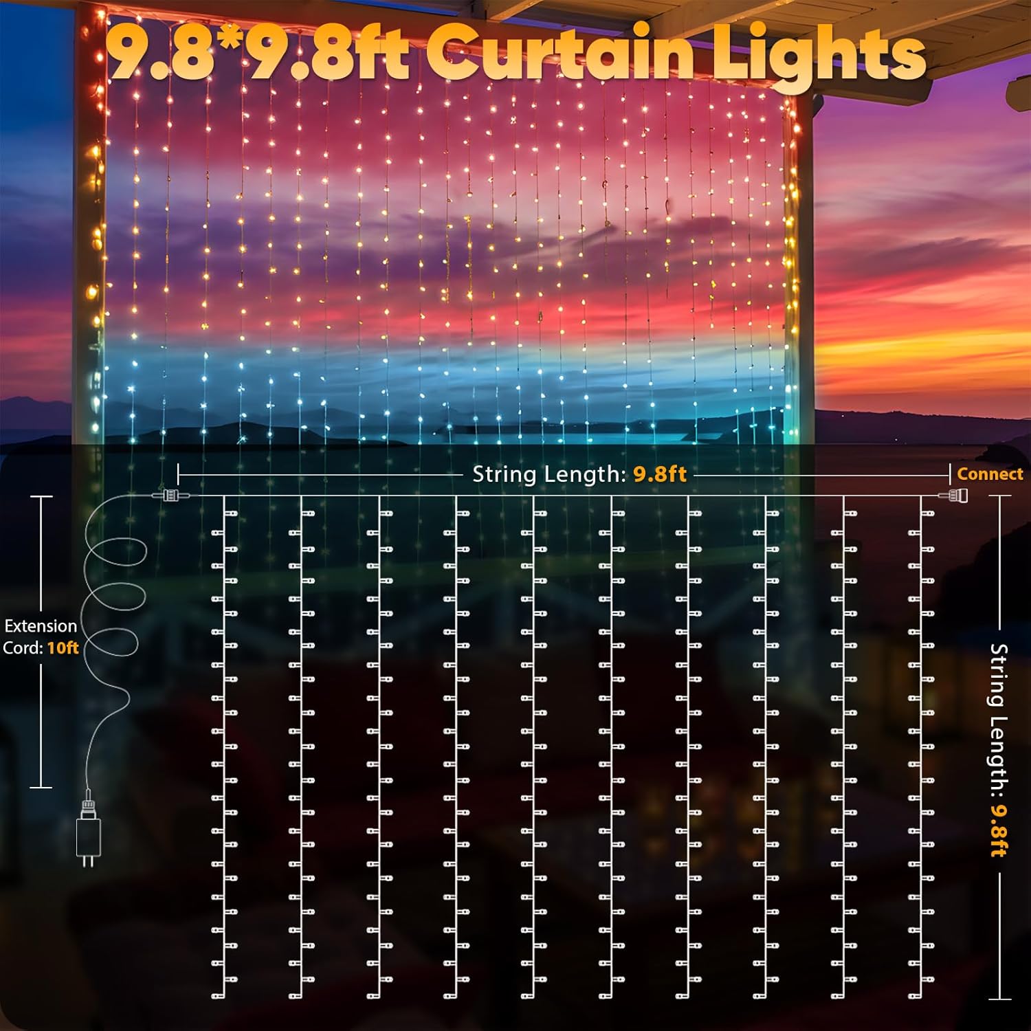 - 【Creating a Romantic Atmosphere】The color scheme of the 300 LED Sunset Curtain Lights is inspired by the hues of the horizon and the ocean during sunrise or sunset. These lights vividly recreate the enchanting coastal sunset ambiance, seamlessly infusing tranquility and romance into any space, and crafting your exclusive cozy moments.
