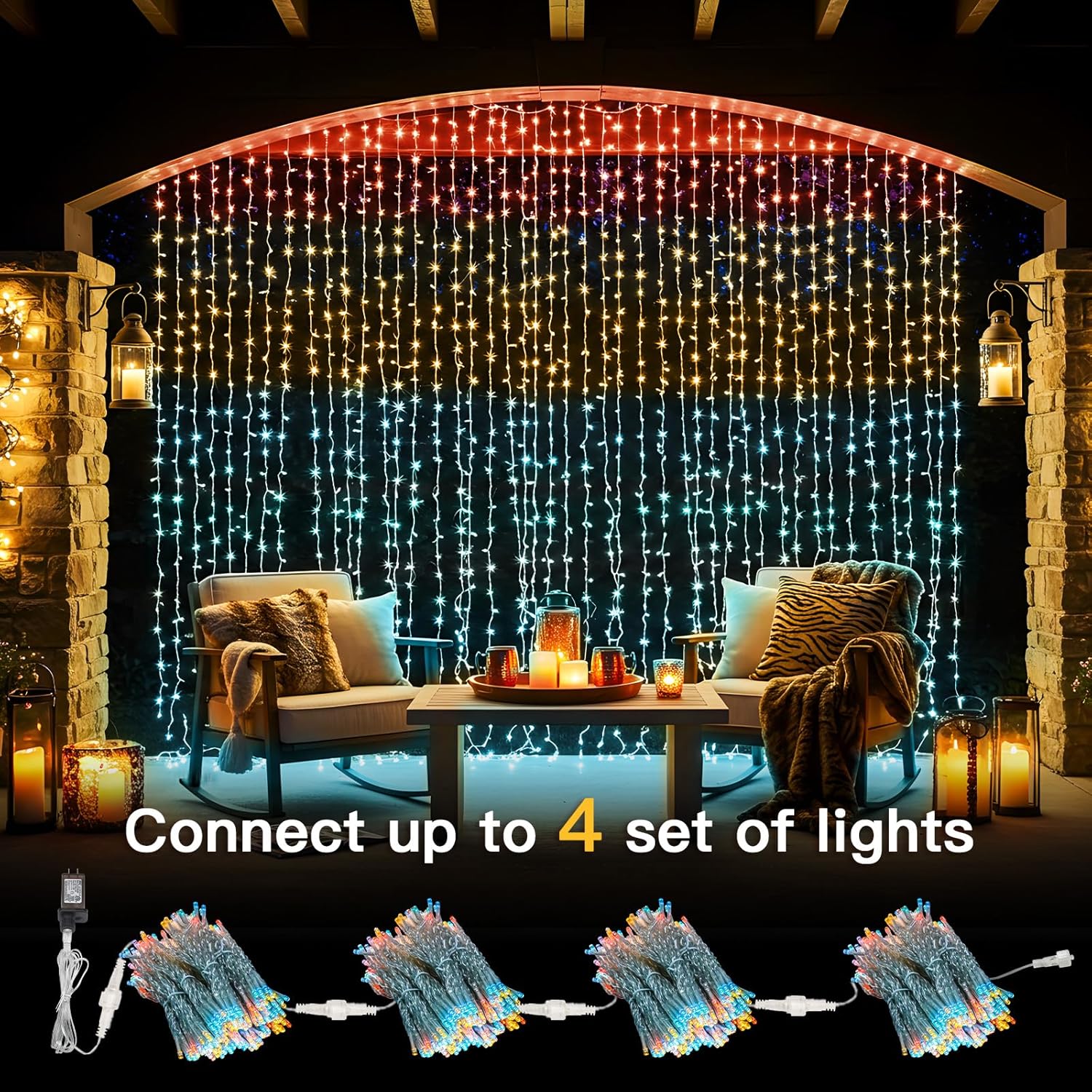 - 【Powerful Connectivity and Expansion Capability】No additional outlets are needed. You can seamlessly connect up to 4 sets of curtain lights, reaching a total length of 40 feet. This enables you to create a stunning waterfall lighting effect in large spaces, whether it's for decorating a wedding arch, a photo backdrop, or an outdoor pergola. It can instantly turn any area into a dazzling paradise.
