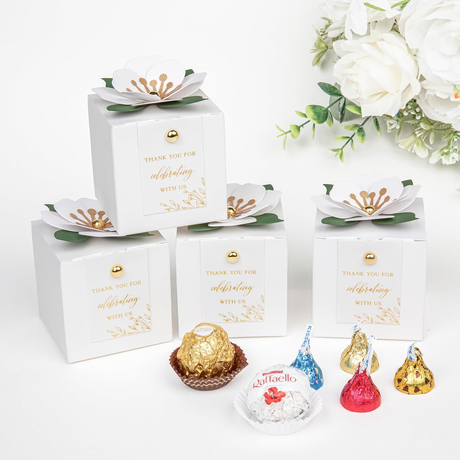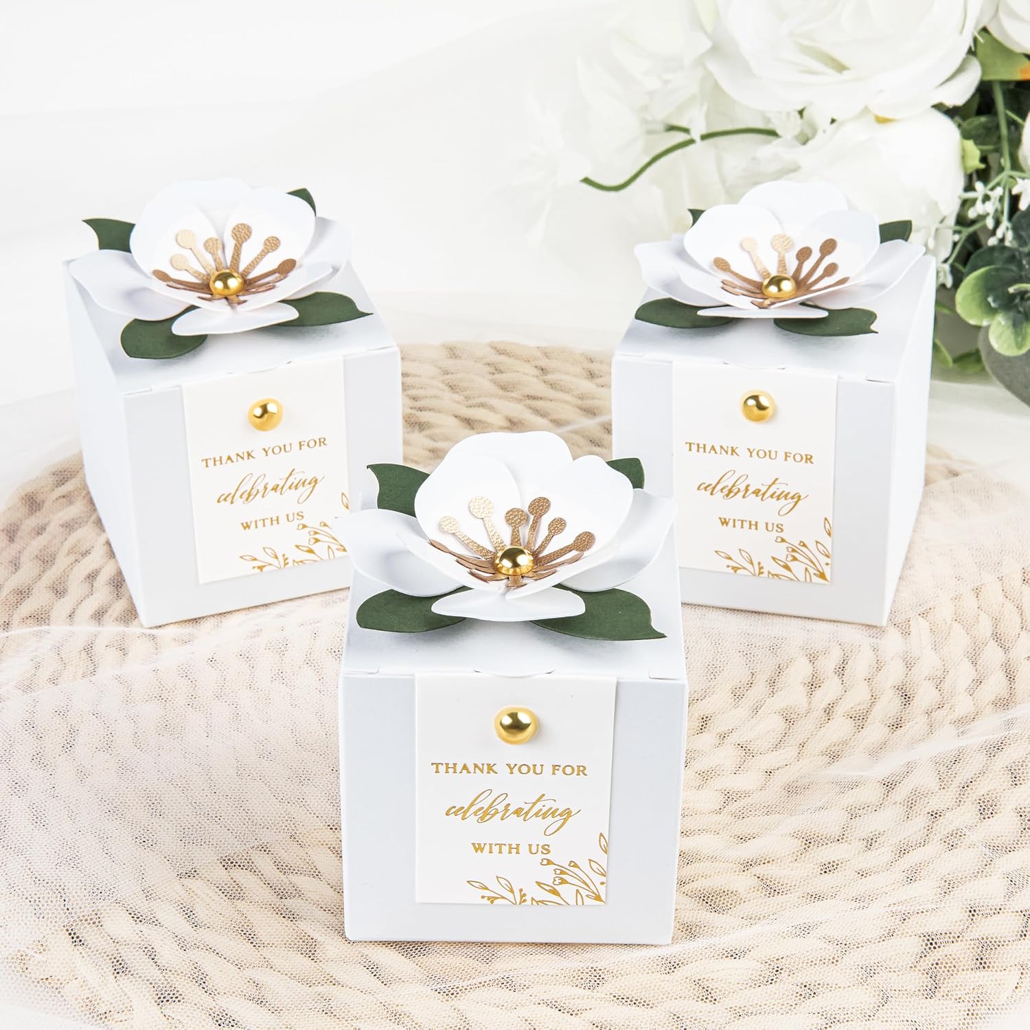 - 【3 in 1 favor boxes】: Include 20* unfold candy boxes, 20* white flower decor, 20* white thank you tags, 40* gold buttons. (The boxes need to be folded by yourself)