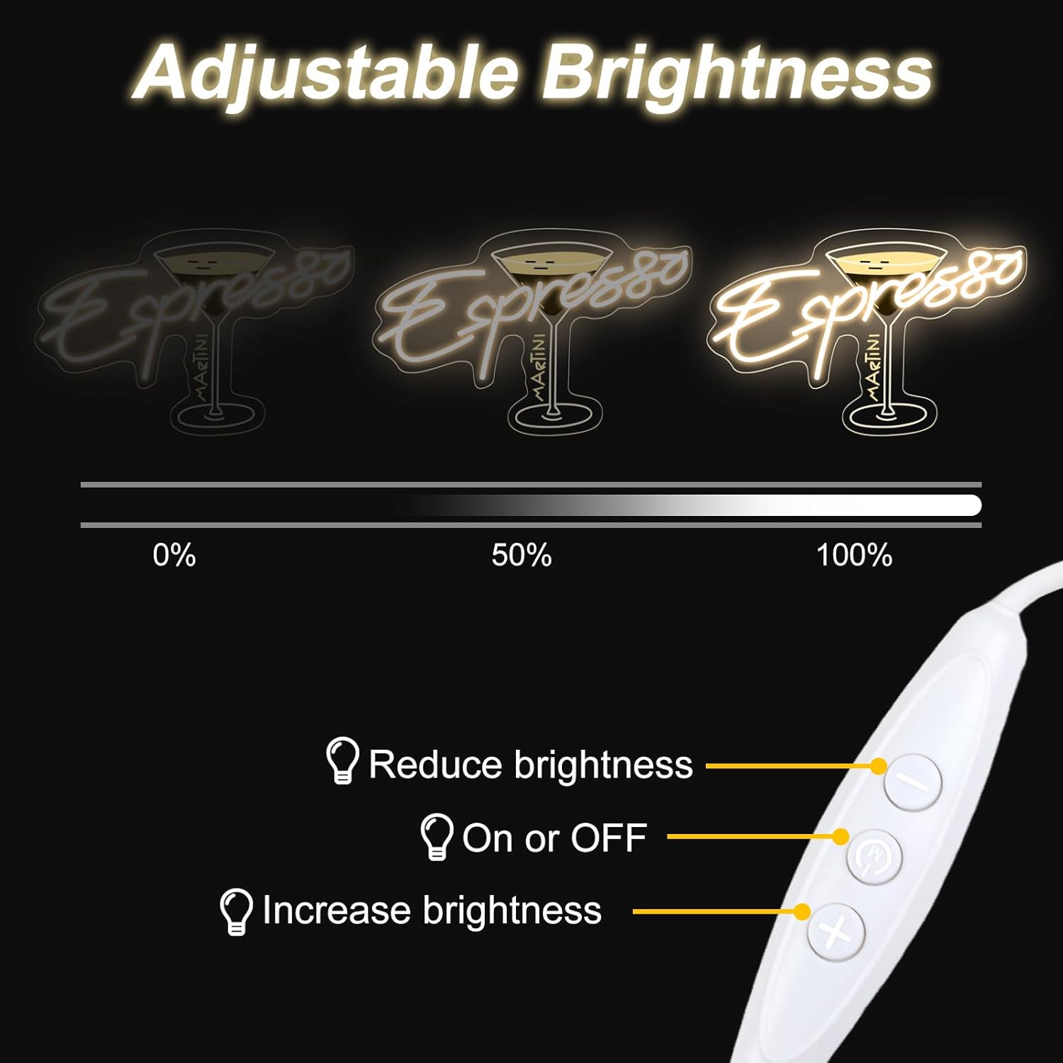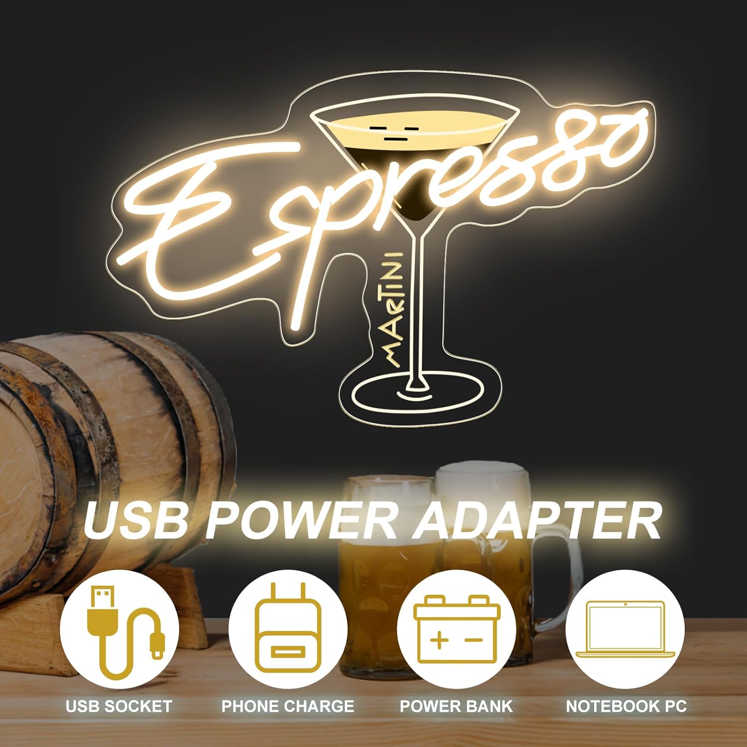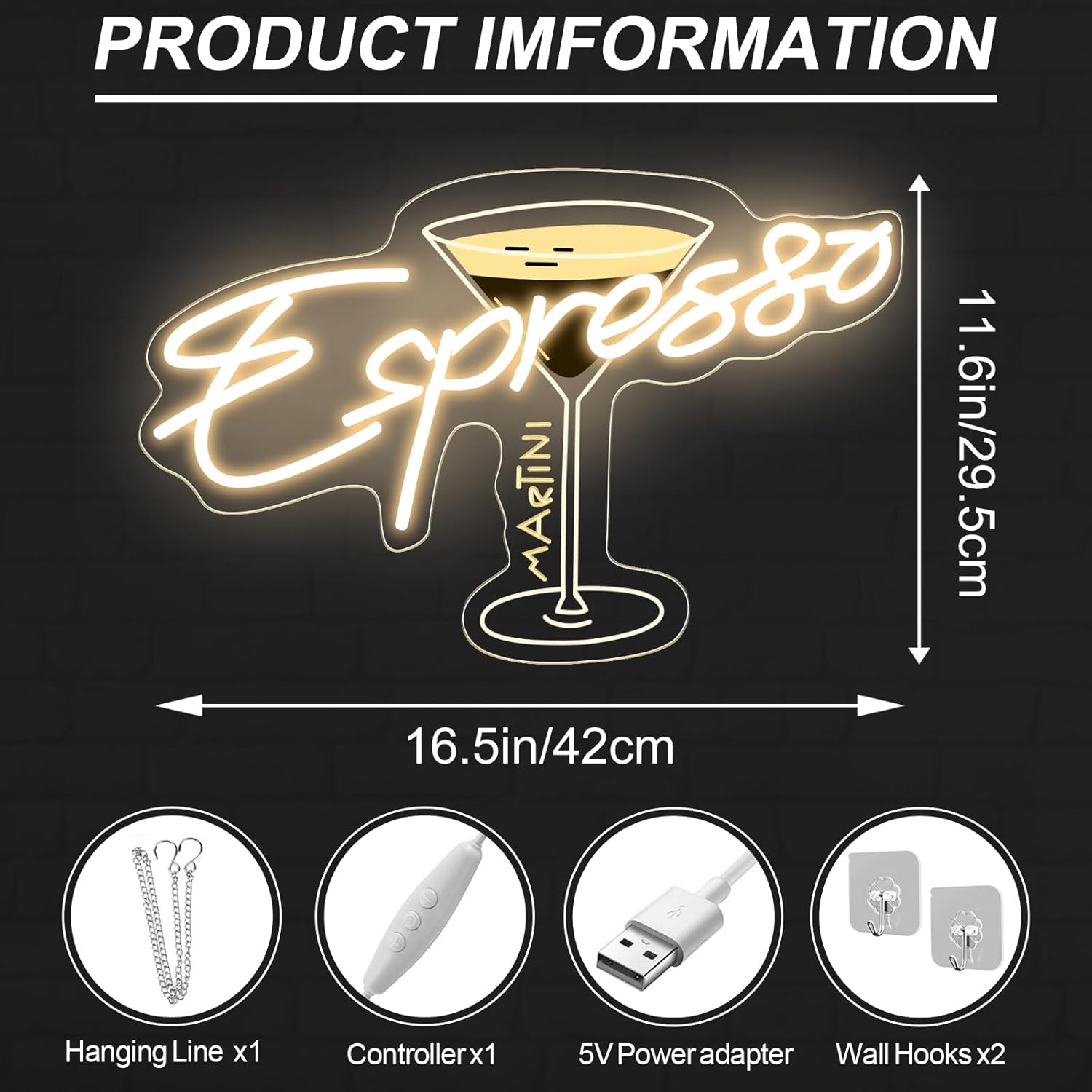 - What you get: Espresso martini neon sign x1, hanging chain x1, wall hooks x2. Every LED light undergoes rigorous quality checks before it ships. If you have any problem with our neon light, please feel free to contact us. We will try our best to serve you