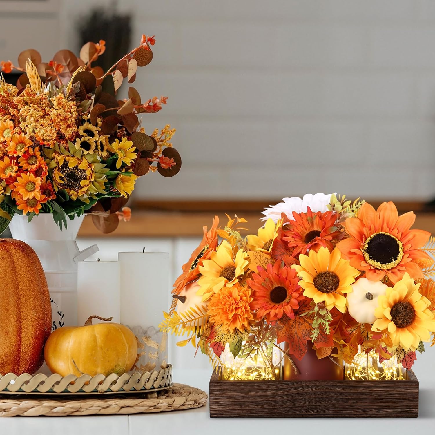 - Package Content: the Thanksgiving centerpiece set includes 1 wood tray, 3 glass jars, 3 fall pumpkin maple leaf bouquets, and 2 charming lights; Each artificial fall potted plant can be placed alone as a decoration or combined in the tray to bring an autumn atmosphere to your home