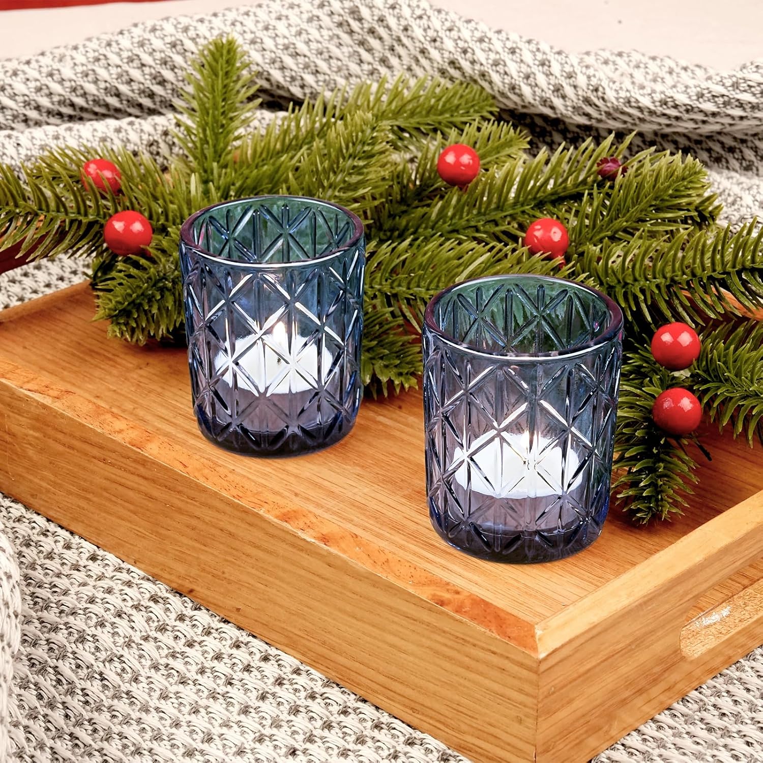 - 🕯 48 Pcs Candle Holder Set: Package includes 48 blue glass votive candle holders, plenty of them for your family. The height of each tea light candle holder is 2.5 inches/6.5 cm and the diameter of the bottom is 2 inches/5 cm.