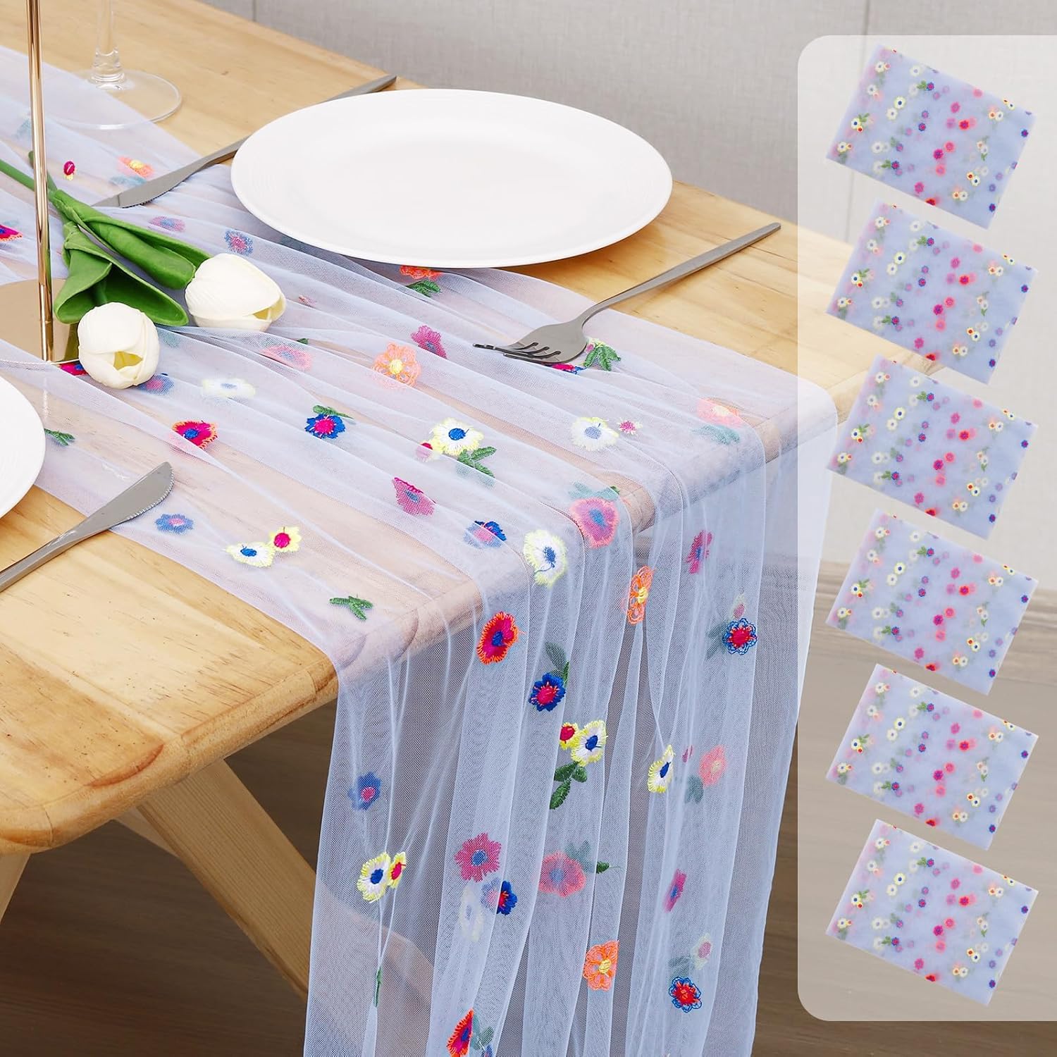 6PCS Blue Floral Table Runner 10 FT, Embroidery Daisy Table Runners Seasonal Sheer Tulle Table Runner for Thanksgiving Wedding Birthday Baby Shower Party