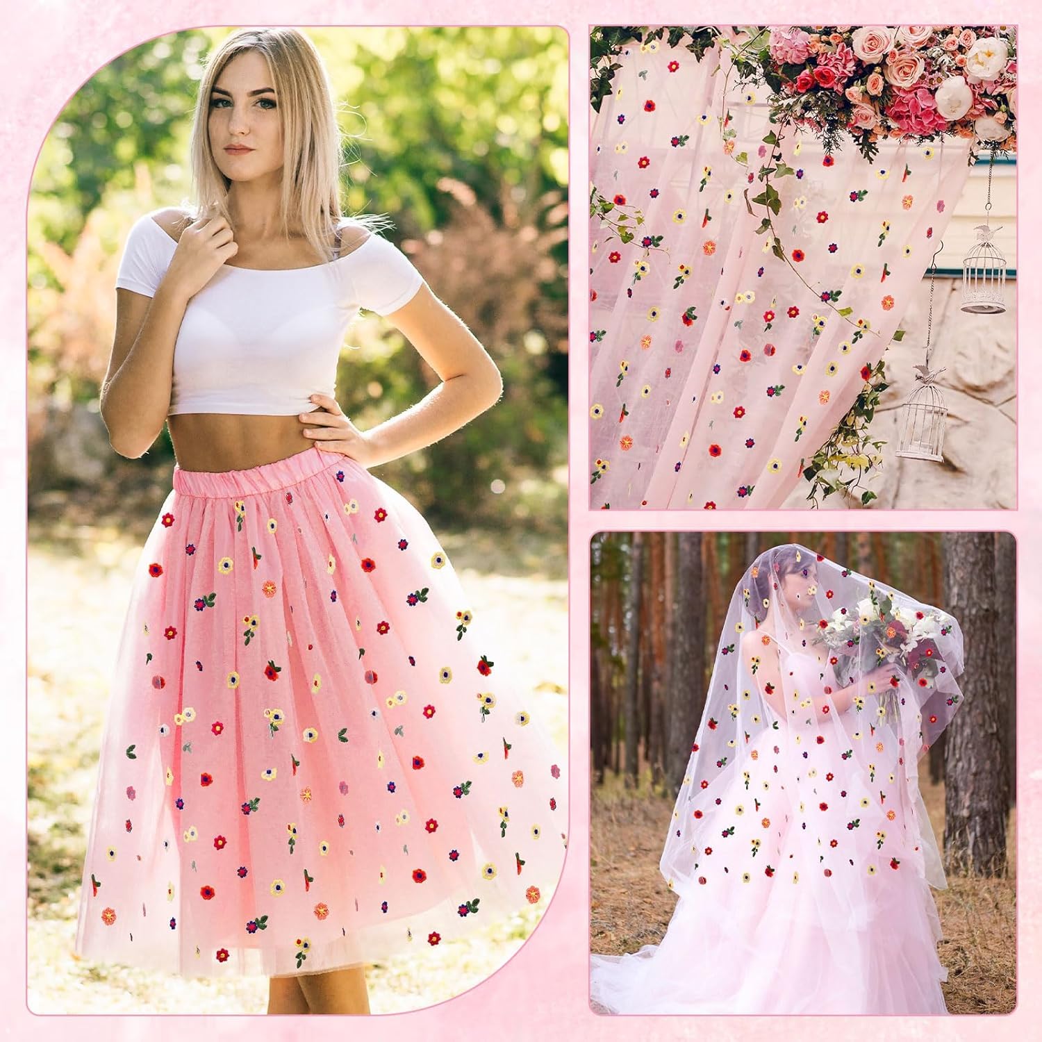 6PCS Pink Floral Table Runner 10 FT, Embroidery Daisy Table Runners Seasonal Sheer Tulle Table Runner for Thanksgiving Wedding Birthday Baby Shower Party