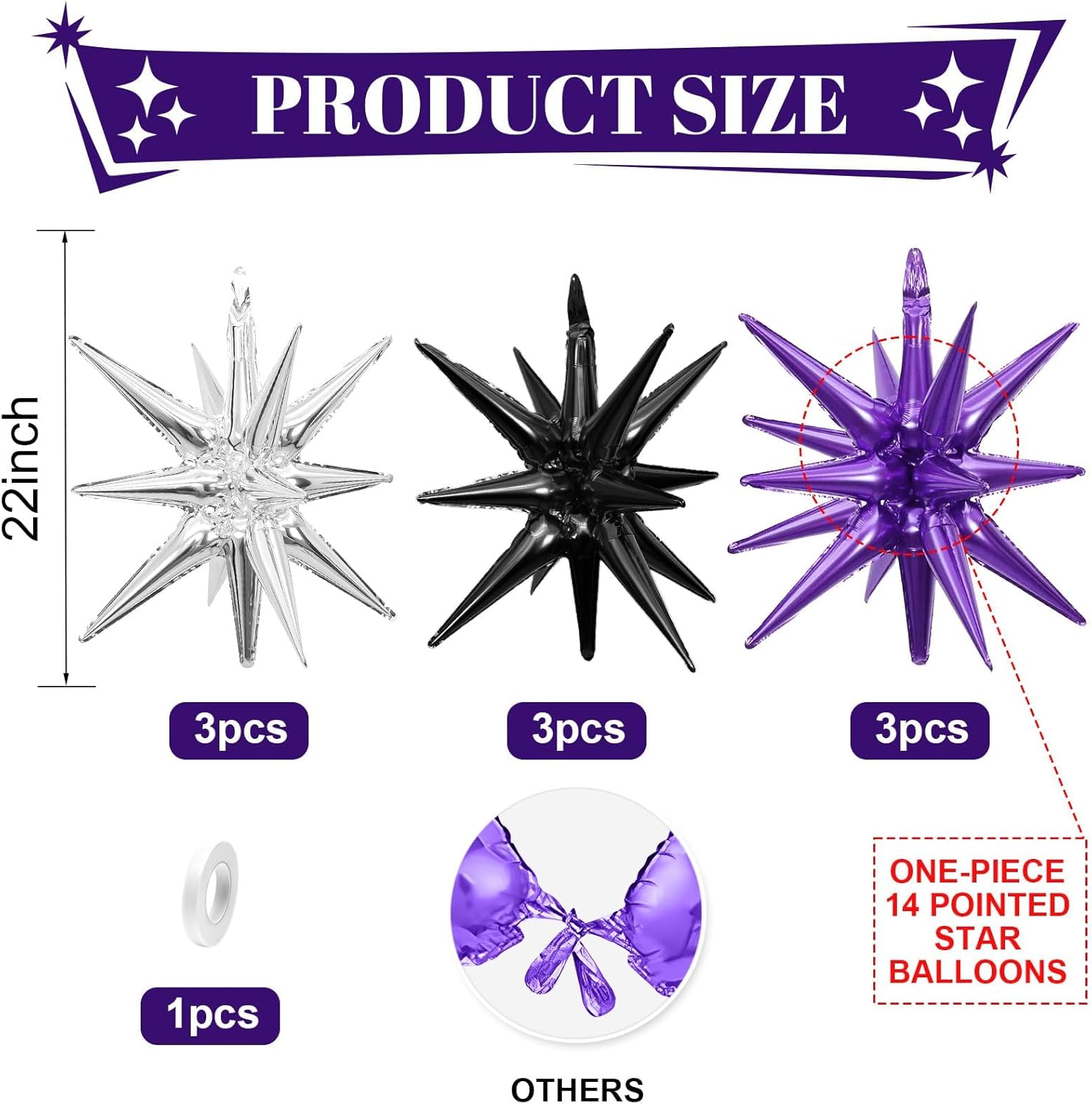 - Black Purple Silver Star Balloons Set:Package include 9pcs 22Inch explosion star balloons(black x 3,purple x 3,silver x 3).Large enough to help you better decorate your party.