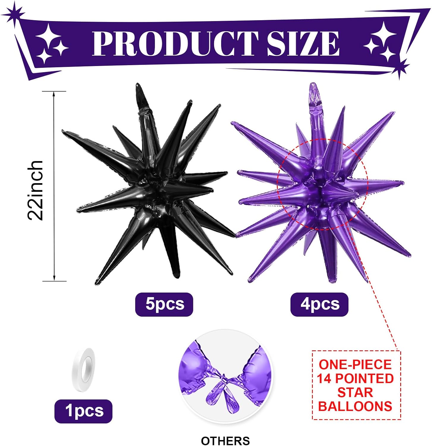 - Black Purple Star Balloons Set:Package include 9pcs 22Inch explosion star balloons(black x 5,purple x 4).Large enough to help you better decorate your party.