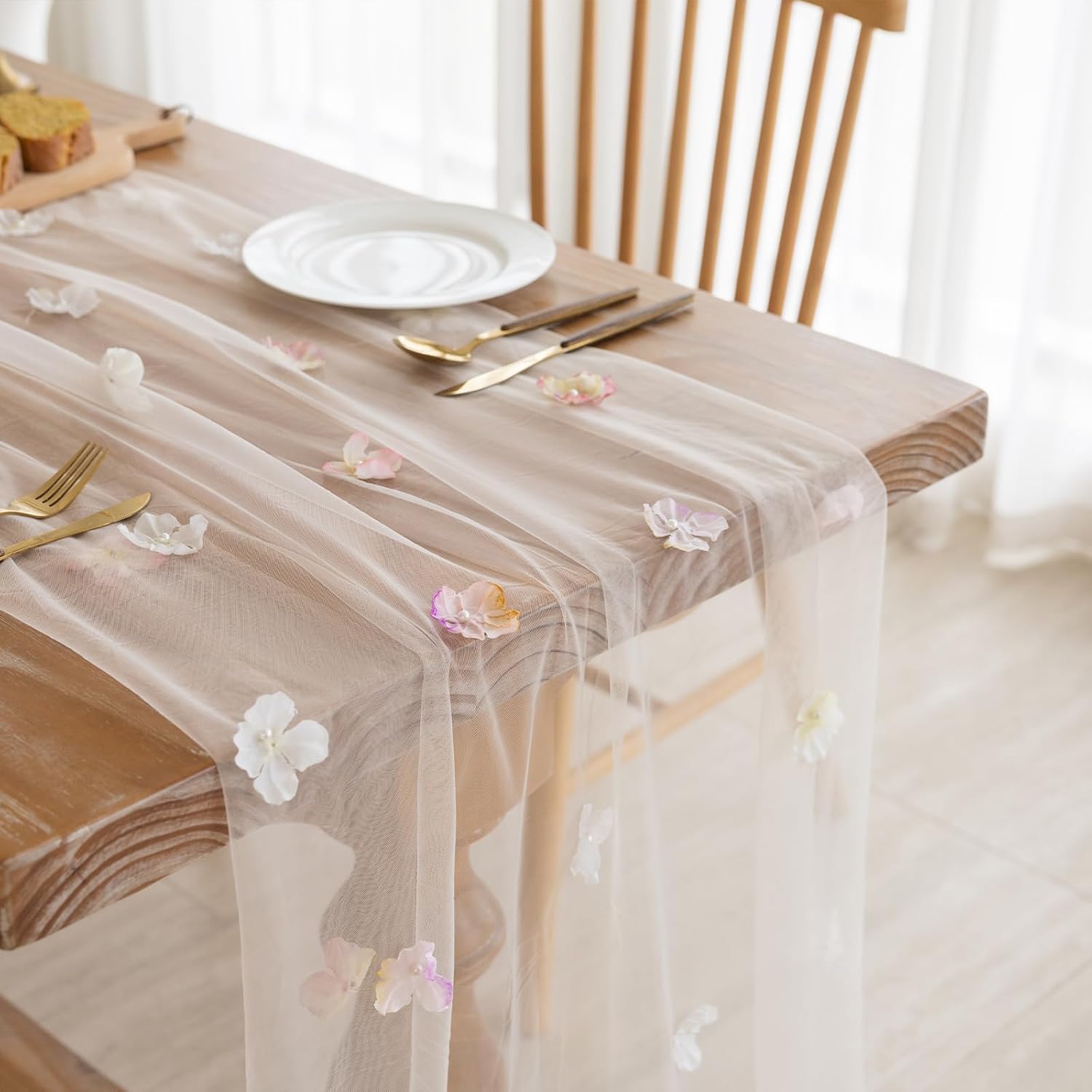 Romantic Artificial Floral Table Runner 10ft Gauze Tulle Lace Table Runner Set for Wedding Baby Shower Bridal Shower Holiday Kitchen Dining Table Decoration for Home Party Special Occasion (2Pcs)