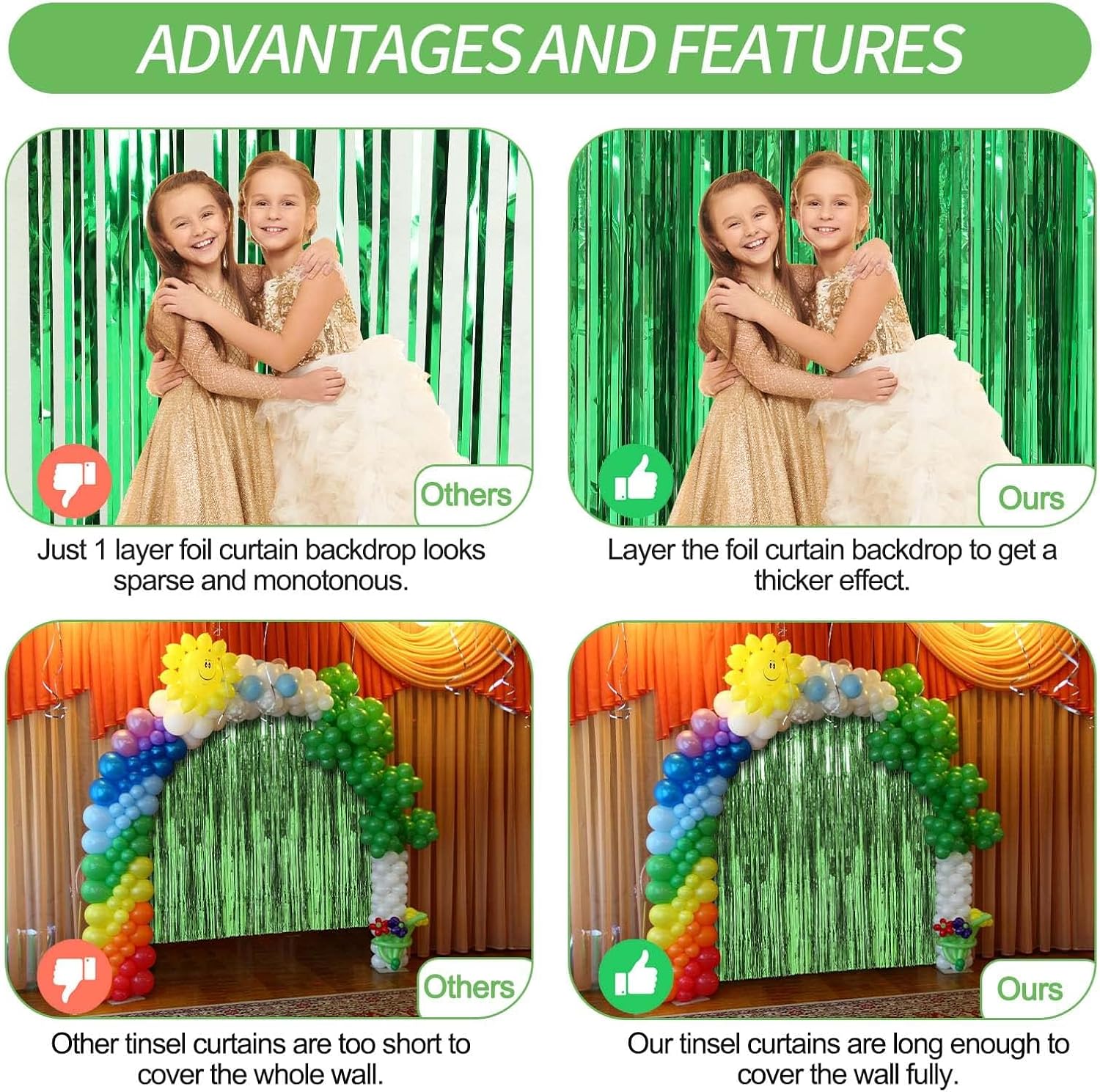 - Durable & Reusable - These party backdrop are made of durable tinsel with a shiny surface, which will keep the shimmer effect all the time, so they can be reused at another time, and light up your parties every time.