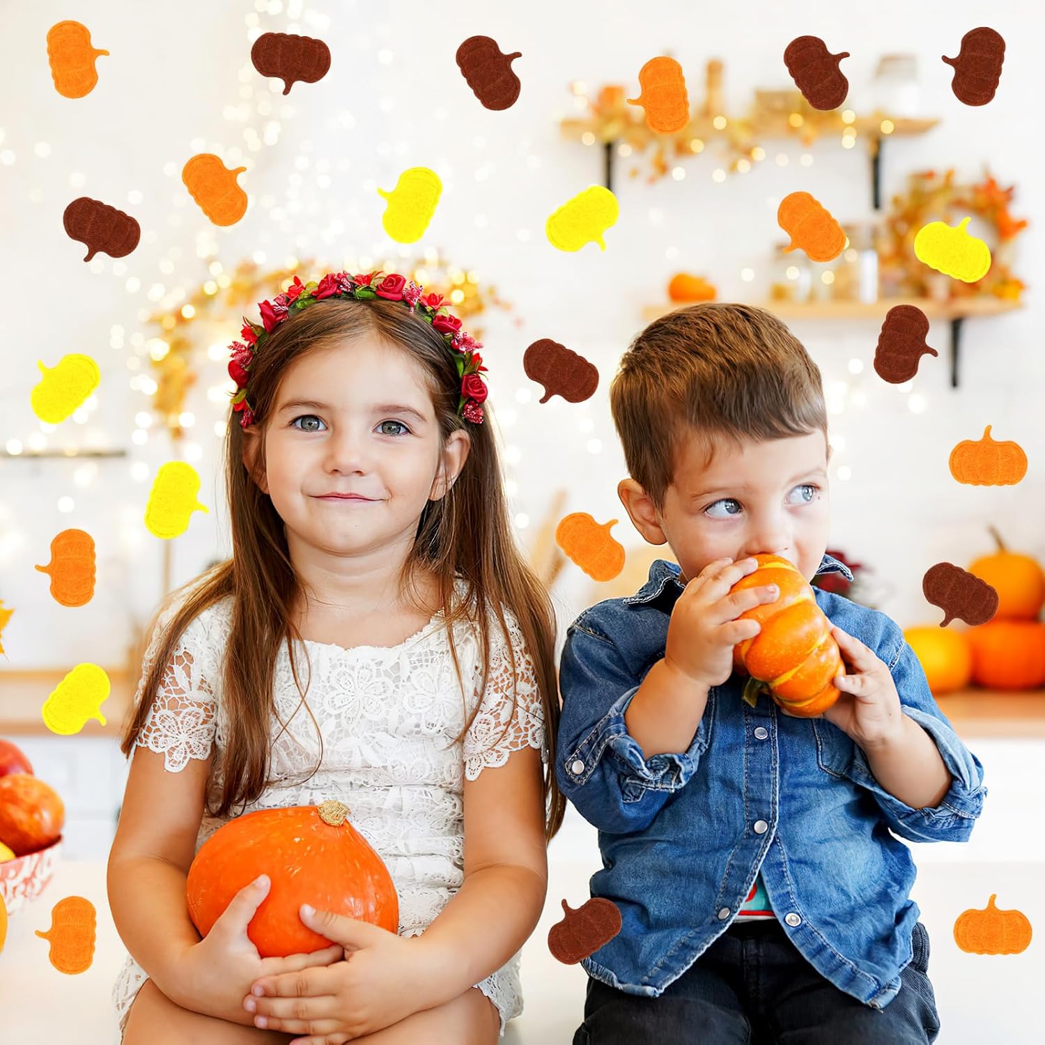 - Fall-Themed Design: These charming pumpkin confetti features classic autumn colors—deep brown, light brown, orange, and yellow—capturing the essence of the autumn. The festive colors blend seamlessly with Thanksgiving setups, adding warmth and joy to your celebrations