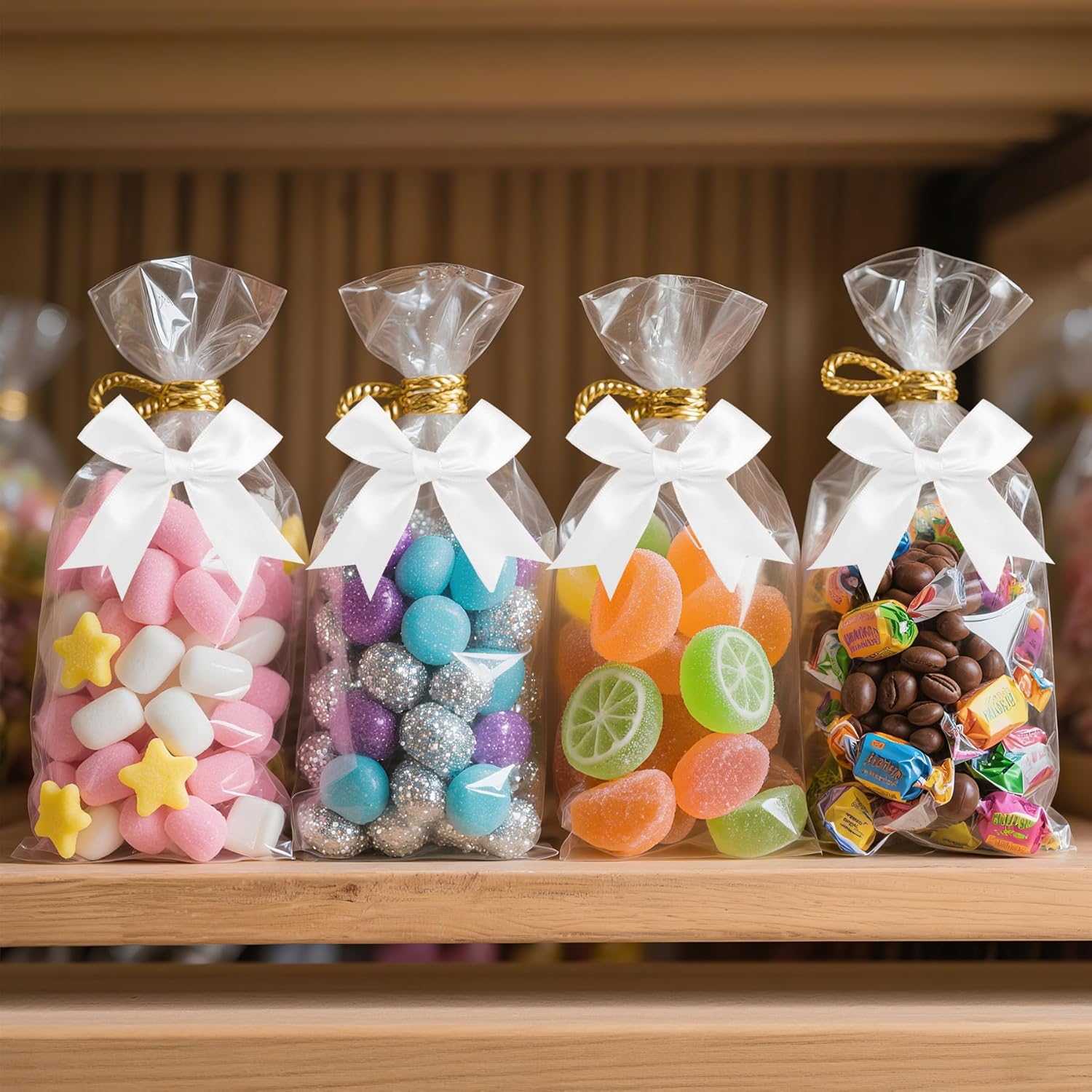 50 PCS Twist Tie Bows Satin Ribbon Bows 3.3 Inch Gift Wrap Bows Craft Bows for Gift Wrapping, Party Decorations Gifts Bag DIY Treat Bags Wedding Decor Baby Shower Christmas (White)