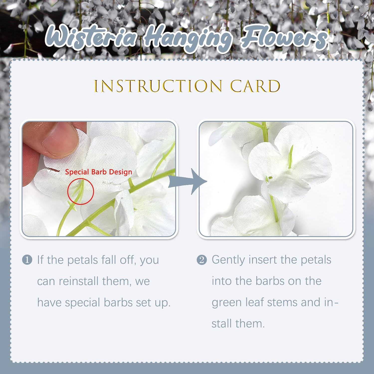 - 【Easy to Install】The grey wisteria flower vines stem are made of durable metal wire and covered with plastic. You can bend the wisteria flower in any shape to satisfy your decoration imagination without damaging it. And the wisteria flower is very easy to install and remove, you can reduce a lot of troubles on installation.