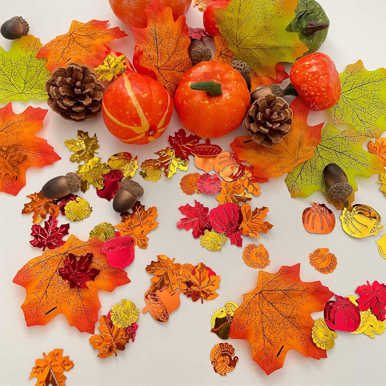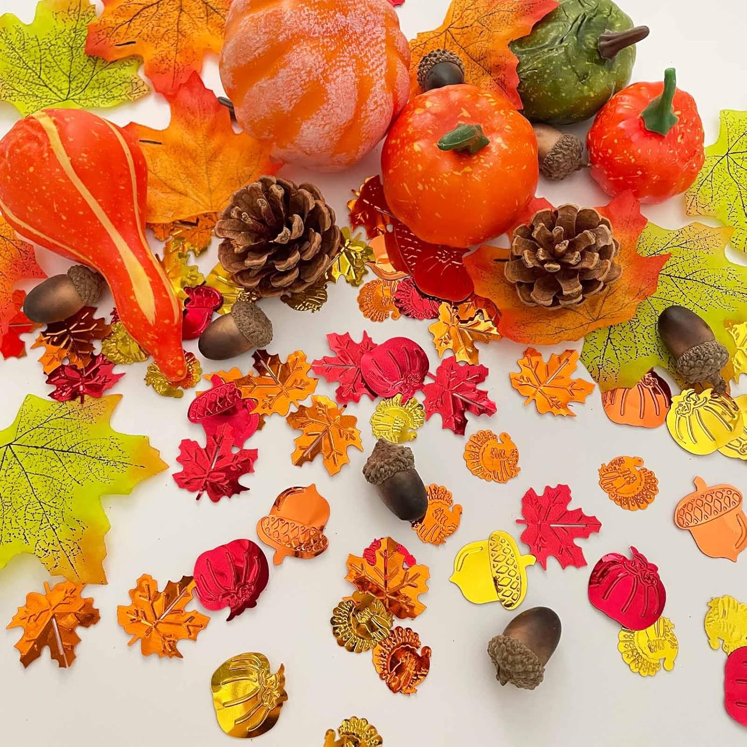 - Thanksgiving Table Glitter: Includes 20mm shaped confetti pieces featuring turkeys, pumpkins, maple leaves, and pinecones for perfect autumn table decor