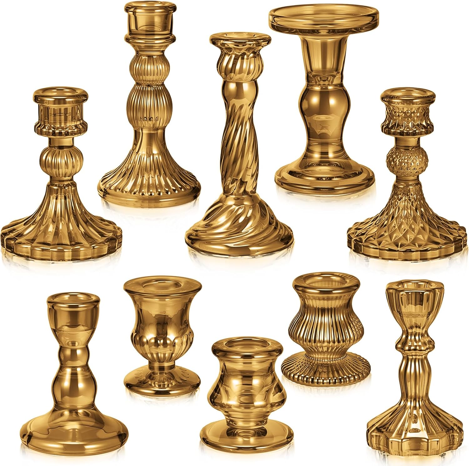 - Package Contents: you will receive 10 pieces 10 style glass candle holders in different sizes, which have different heights, smooth shapes and smooth finishes; The candlestick holder add a clean, and elegant aesthetic to any space, it is suitable for a variety of candles