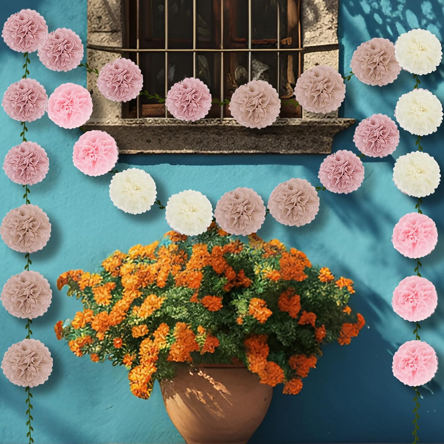 - [Packaging includes] 3x 6 inches Nude pink tissue paper pompoms, 3x 6 inches Rose pink tissue paper pompoms, 3x 6 inches Linght pink tissue paper pompoms, 3x 6 inches Beige tissue paper pompoms, 2x 6.6FT Vine garland banner