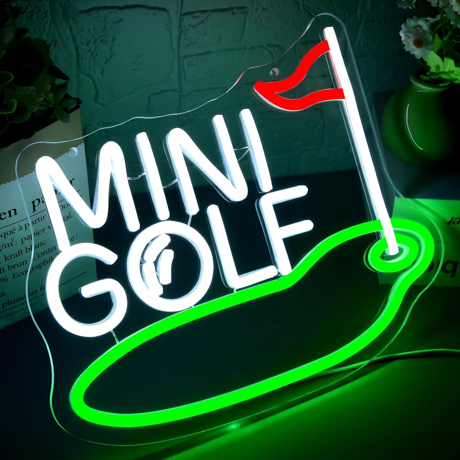 - Unique Design: The golf neon sign centers on mini golf text, paired with a green putting green shape and a red flagged pin, key mini golf icons. Neon like outlines pop against the dark background, using white, green, and red for sharp contrast. It captures the playful, relaxed spirit of mini golf, appealing to enthusiasts and those who love casual, sporty decor, adding a lighthearted, recreational vibe