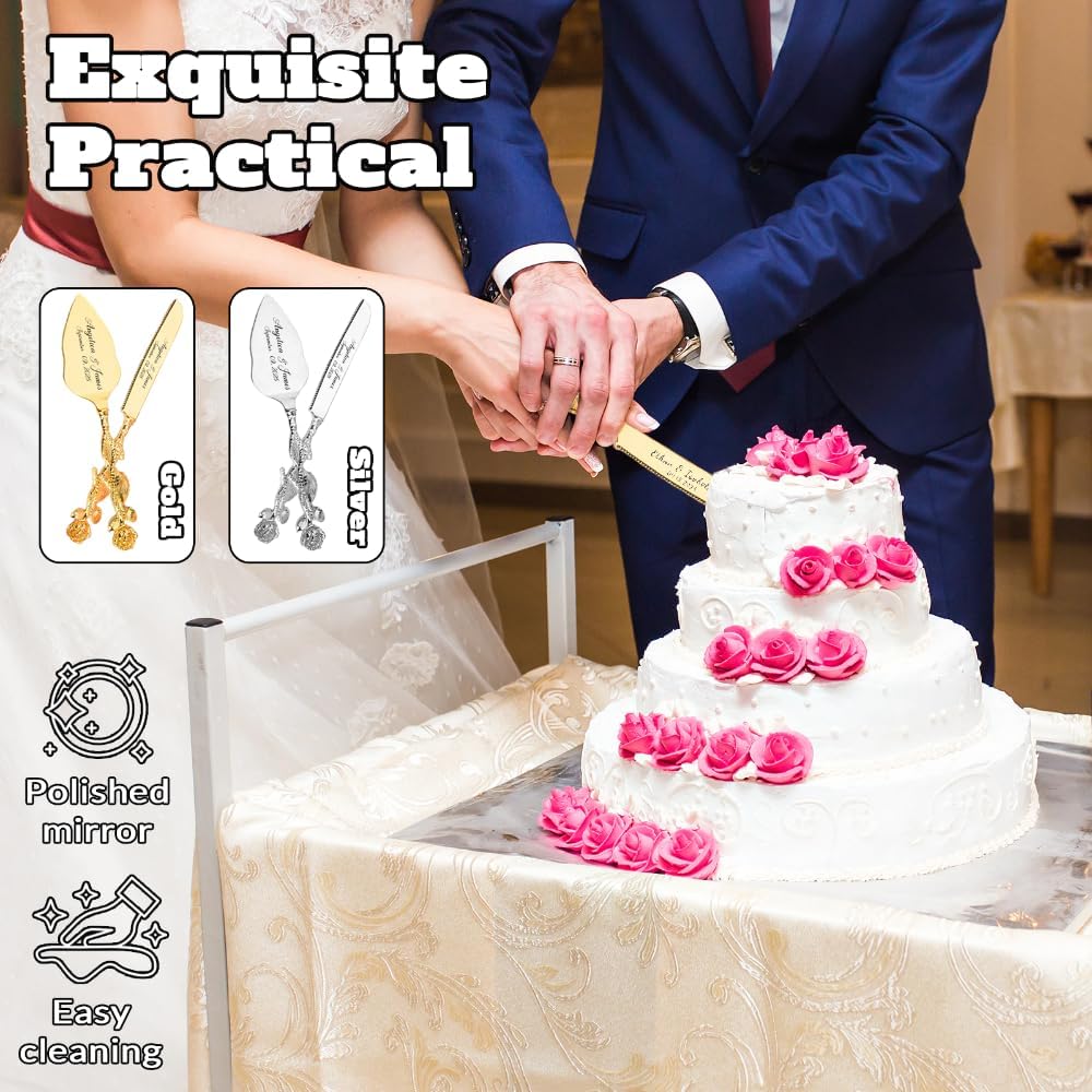 Engraved Personalized Gold Wedding Cake Knife and Server Set - Custom Bridal Cake Serving Gift for Anniversary, Engagement, Birthday Gift