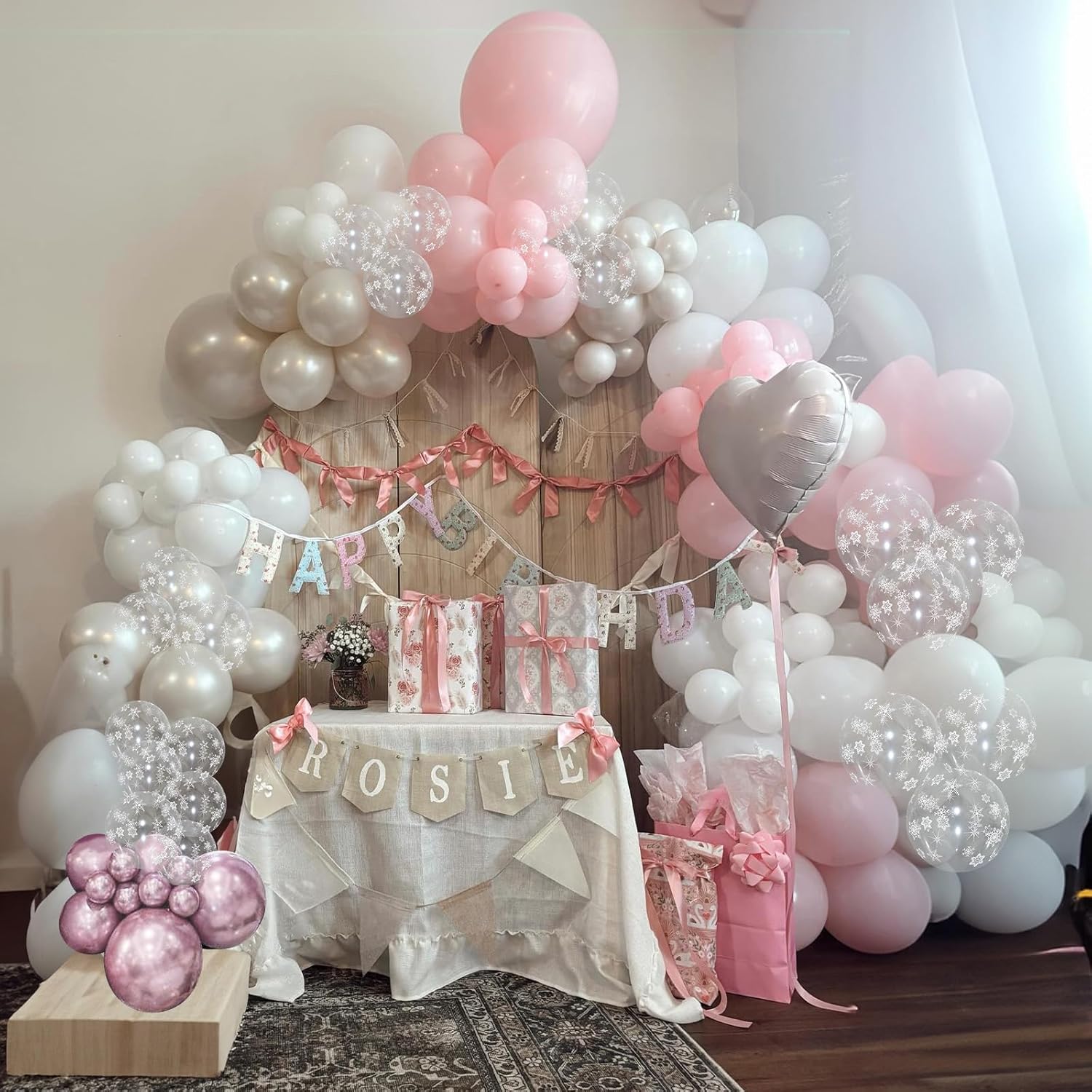 - Snowflake Balloons Set: This light pink pearl white Balloons kit includes 50 high-quality 12-inch balloons in four colors: transparent snowflake latex balloons, pearl white latex balloons, pastel pink latex balloons and pastel metallic pink latex balloons, plus a pink ribbon. It’s perfect for decorating winter wonderland theme parties, girls winter princess birthdays, snow princess parties, and winter baby shower parties, adding a vibrant touch to any celebration
