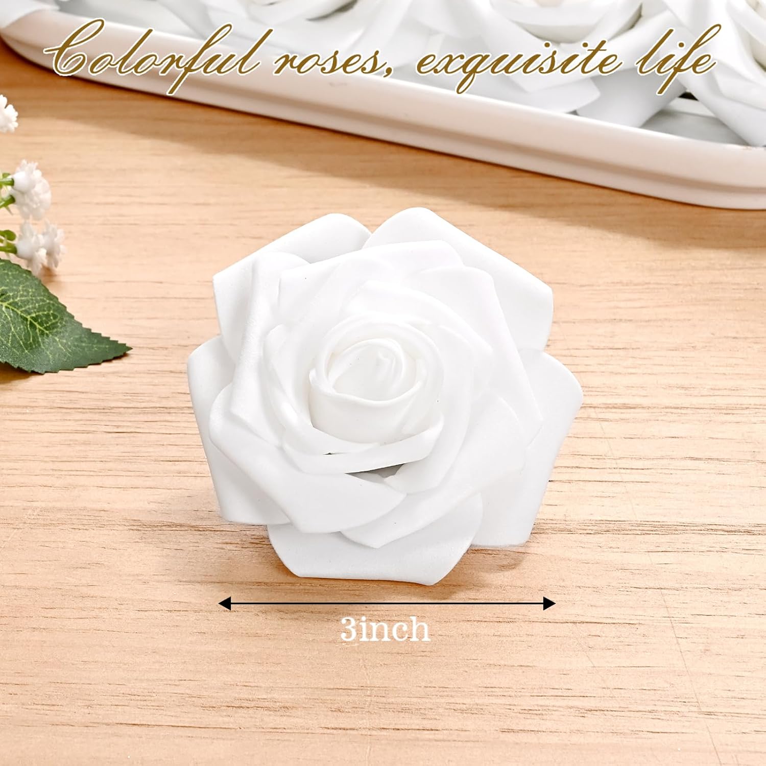 - Kindle Your Creative Flames: The box includes 16 white roses (3" flower head, 8" stem) and 4 green rose leaves, perfect for an array of DIY crafts. Whether creating wedding bouquets, graduation or birthday party ornaments, baby shower decorations, or cake adornments, our faux roses add a touch of class to every important moment.