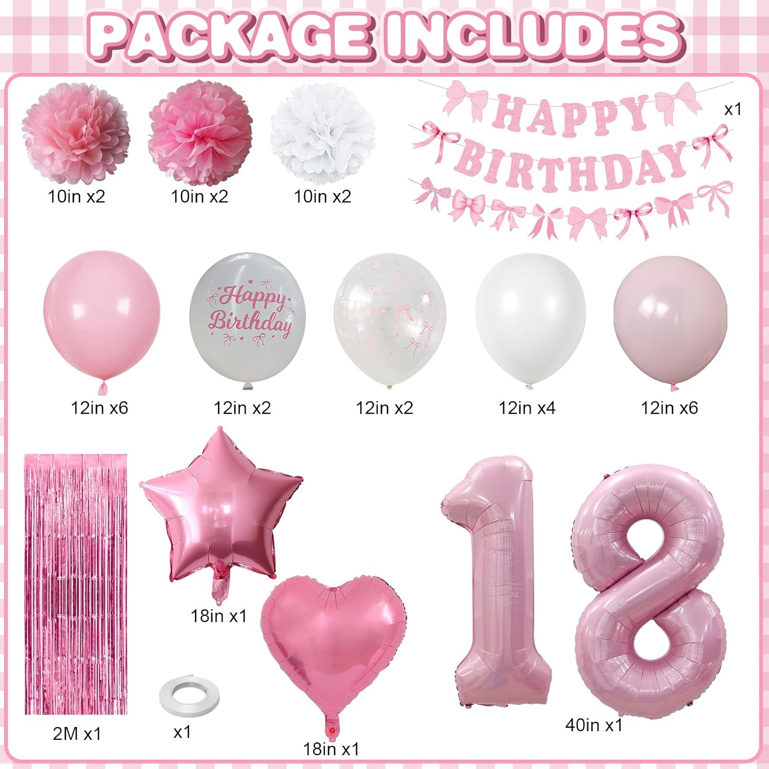 - PACKAGE INCLUDES: 1pc pearl pink number 18 balloon, 1pc bow happy birthday banner, 2pcs pink paper pom poms, 2pcs light pink paper pom poms, 2pcs white paper pom poms, 1pc pink curtain, 1pc light pink star foil balloons, 1pc light pink heart foil balloons,6pcs light pink balloons, 6pcs pastel pink balloons, 4pcs white balloons, 2pcs birthday printed balloons, 2pcs bow clear balloons, 1pc ribbon