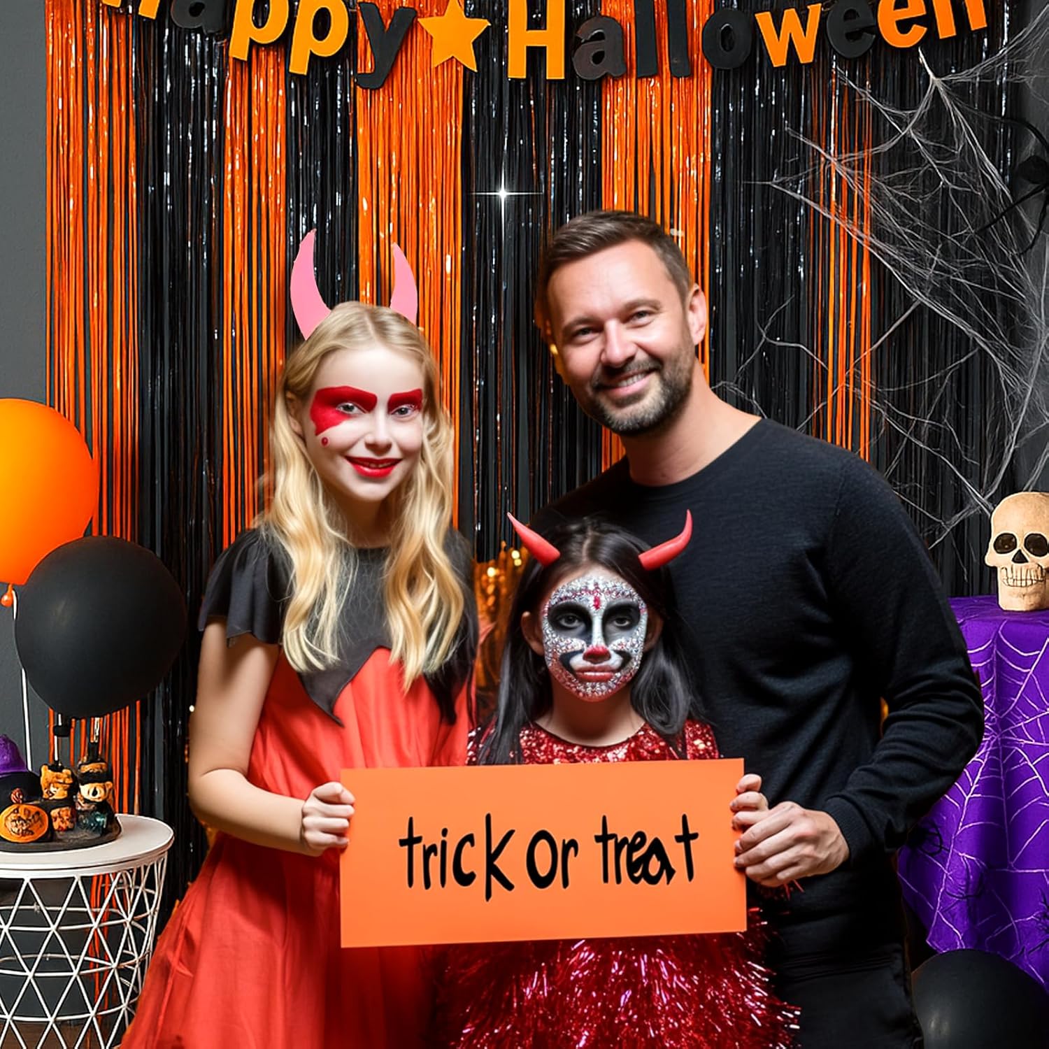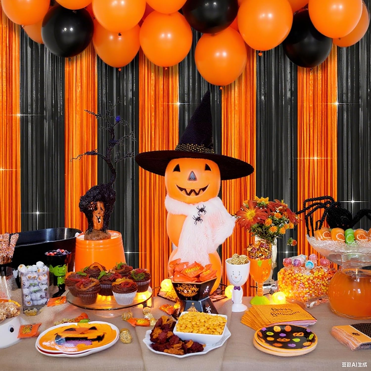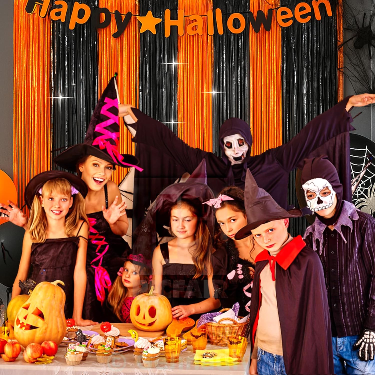 - Halloween Fringe Backdrop: You will receive 4 pieces orange and black tinsel backdrop, each pack curtains size is 3.3ft x 6.6ft, enough length for decorate your party. These foil backdrop curtains are perfect for the door or wall to create an impressive decoration for parties, events, and photo booths.