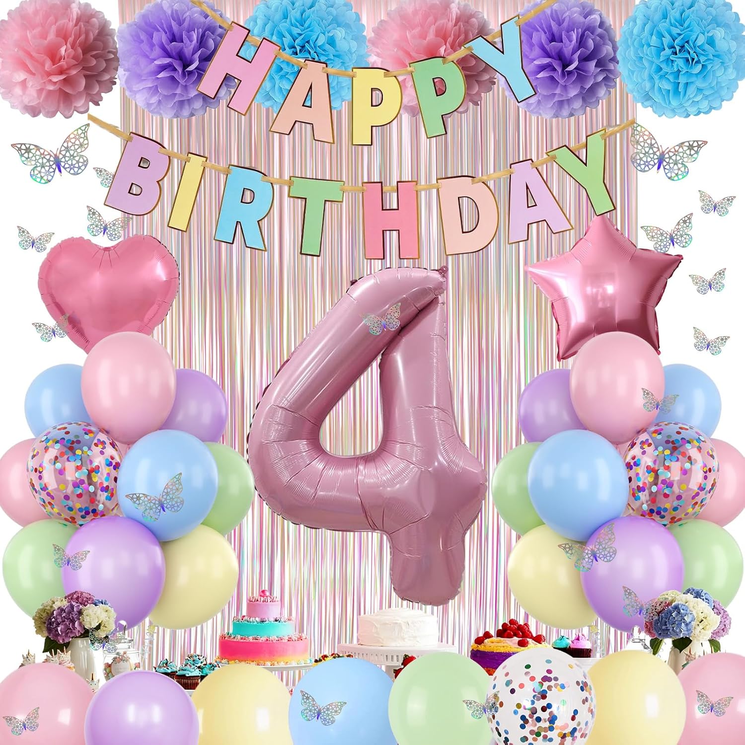 - PACKAGE INCLUDES: 1pc pearl pink number 4 balloon, 1pc happy birthday banner, 2pcs light pink paper pom poms, 2pcs light purple paper pom poms, 2pcs light blue paper pom poms, 1pc colorful white curtain, 1pc light pink star foil balloons, 1pc light pink heart foil balloons, 4pcs pastel purple balloons, 4pcs pastel pink balloons, 4pcs pastel blue balloons, 4pcs pastel green balloons, 4pcs pastel yellow balloons, 4pcs colorful confetti balloons, 1pc butterfly stickers set, 1pc ribbon