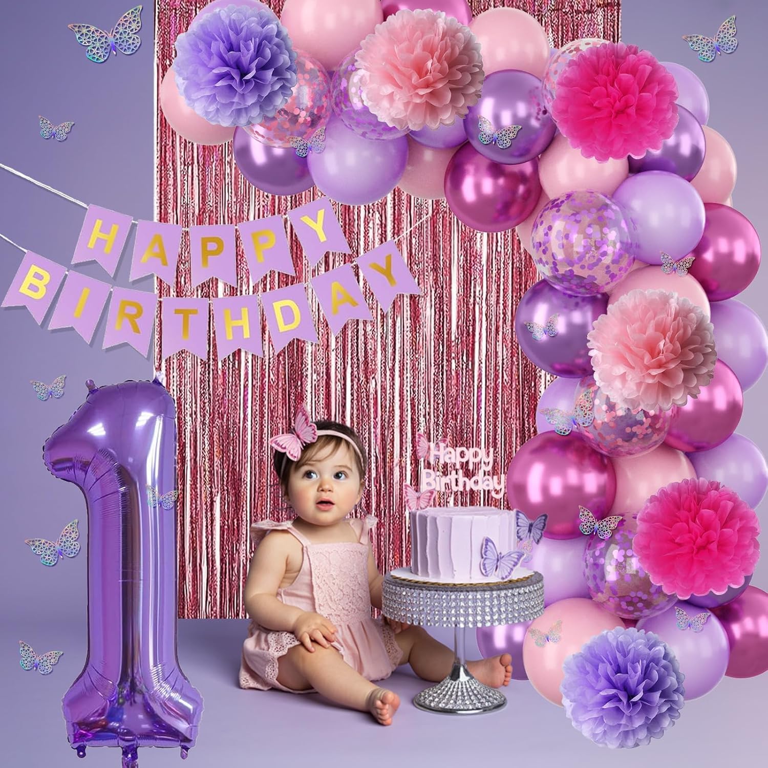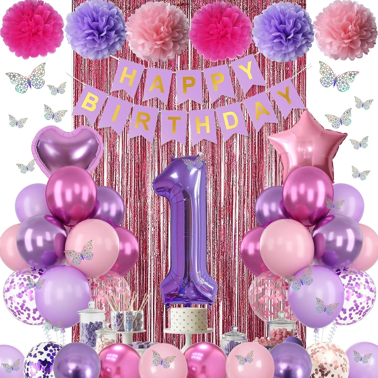 - PACKAGE INCLUDES: 1pc purple number 1 balloon, 1pc happy birthday banner, 2pcs light pink paper pom poms, 2pcs light purple paper pom poms, 2pcs hot pink paper pom poms, 1pc light pink fringe curtain, 1pc light pink star foil balloons, 1pc light purple heart foil balloons, 6pcs pastel purple balloons, 6pcs pastel pink balloons, 4pcs metallic purple balloons, 4pcs metallic magenta balloons, 3pcs purple confetti ballons, 3pcs pink confetti ballons, 1pc butterfly stickers set, 1pc ribbon