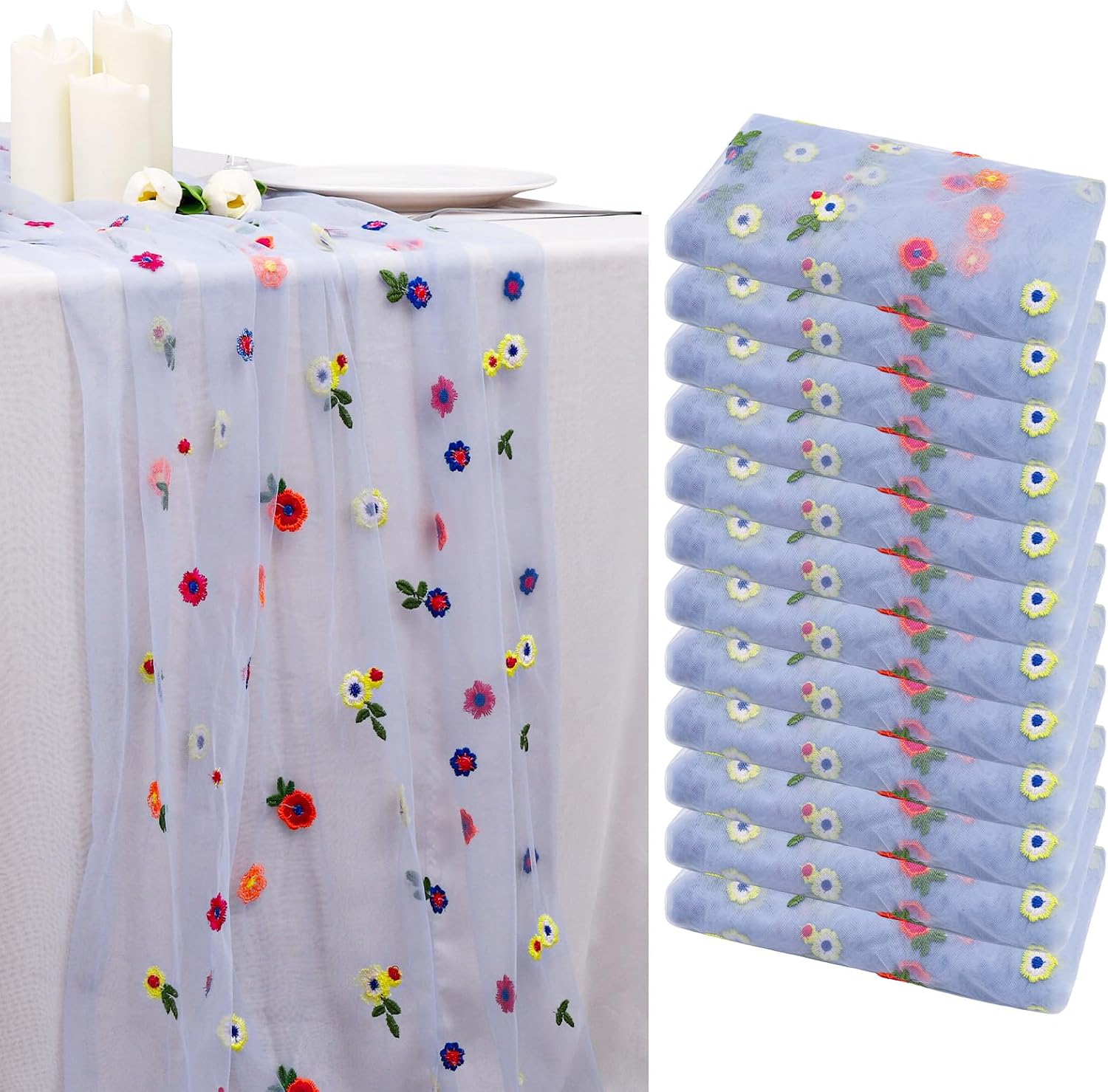 - High-Quality Tulle Fabric: Made from white chiffon fabric, this lightweight embroidered table runner is not only beautiful but also adds a touch of elegance to your dining experience. Each sheer floral table runner measures approximately 29 x 120 inches.