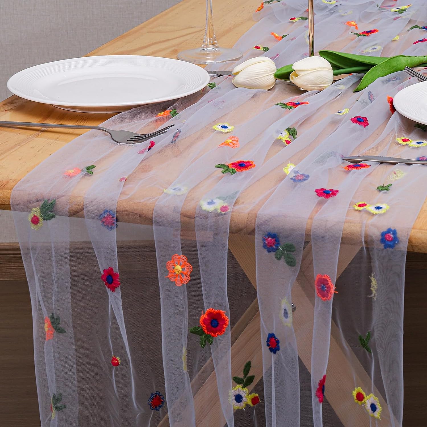 - High-Quality Tulle Fabric: Made from white chiffon fabric, this lightweight embroidered table runner is not only beautiful but also adds a touch of elegance to your dining experience. Each sheer floral table runner measures approximately 29 x 120 inches.