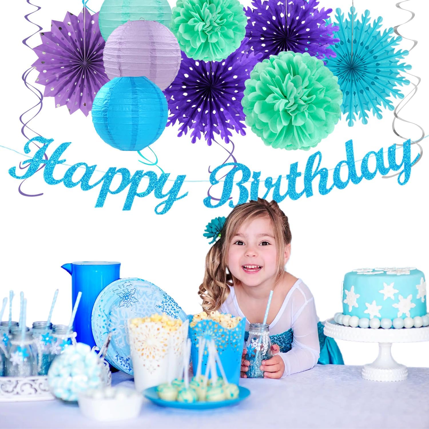 - 【Bue Purple Teal Party Favors】This kits include 1pcs happy birthday banner, 1pcs snowflake paper banner, 4pcs tissue pom poms: 3pcs 10" and 1pcs 12" , 3pcs 8inch paper honeycom ball, 2pcs 8inch paper lantern, 4pcs 12inch paper flower fan, 6pcs Paper swirls hanging streamers.