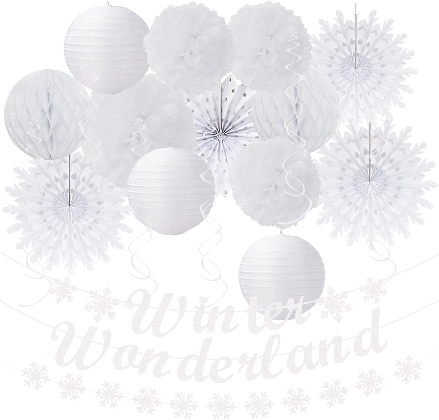- 【Snowflake Snow White Party Favors】This kits include 1pcs winder wonderland banner, 1pcs snowflake paper banner, 4pcs tissue pom poms: 3pcs 10" and 1pcs 12" , 3pcs 8inch paper honeycom ball, 2pcs 8inch paper lantern, 4pcs 12inch paper flower fan, 6pcs Paper swirls hanging streamers.
