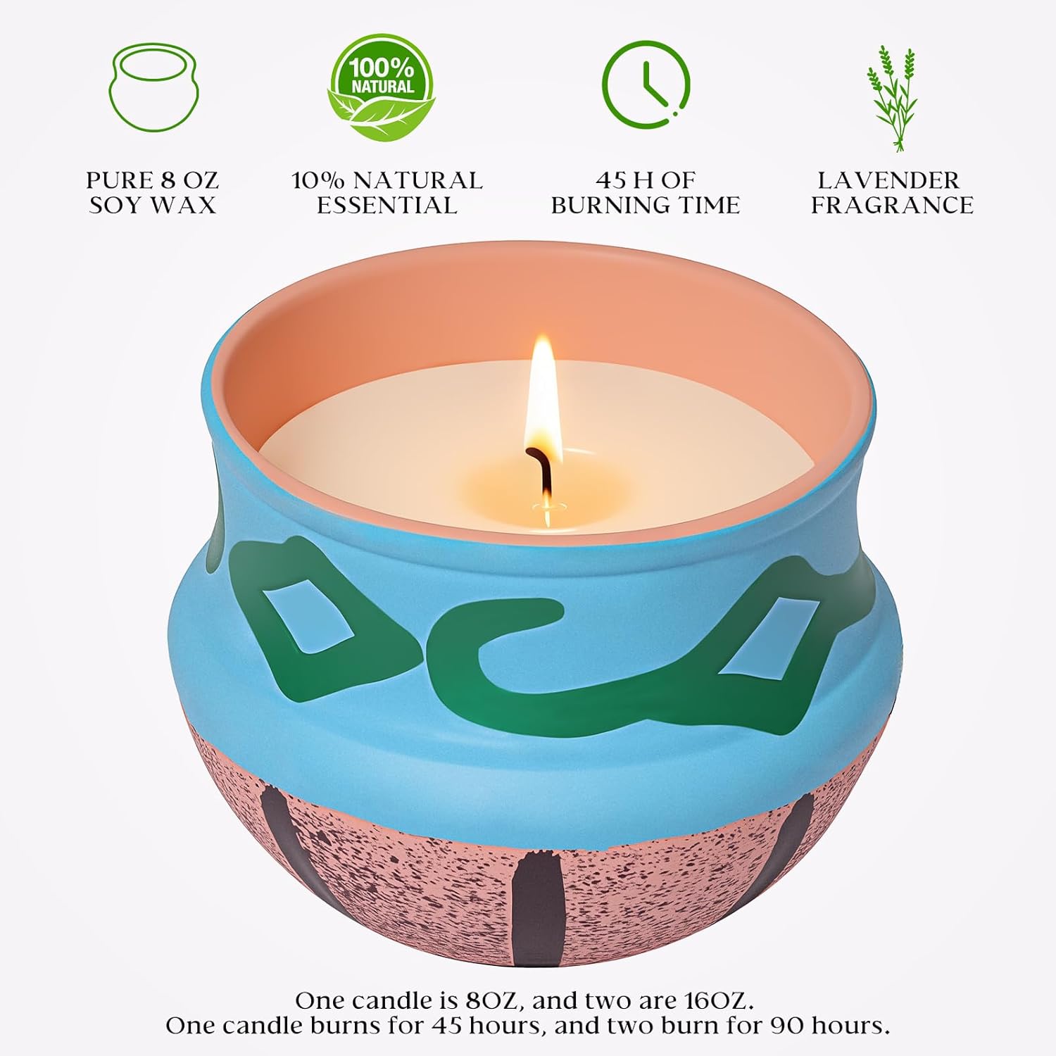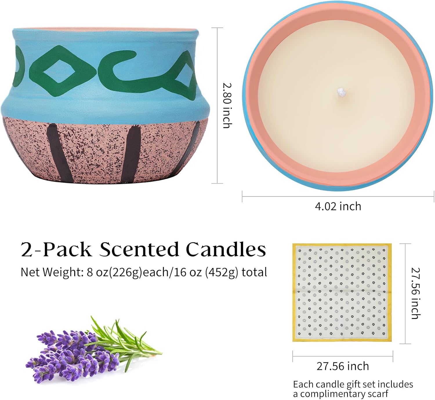 Lavender Candles, Scented Candles Gift Set for Women, Coarse Pottery Container,Natural Soy Wax, Set 2 Pack, Total 16oz, 90 Hours of Burn, One Silk Scarf,Candles for Home Scented