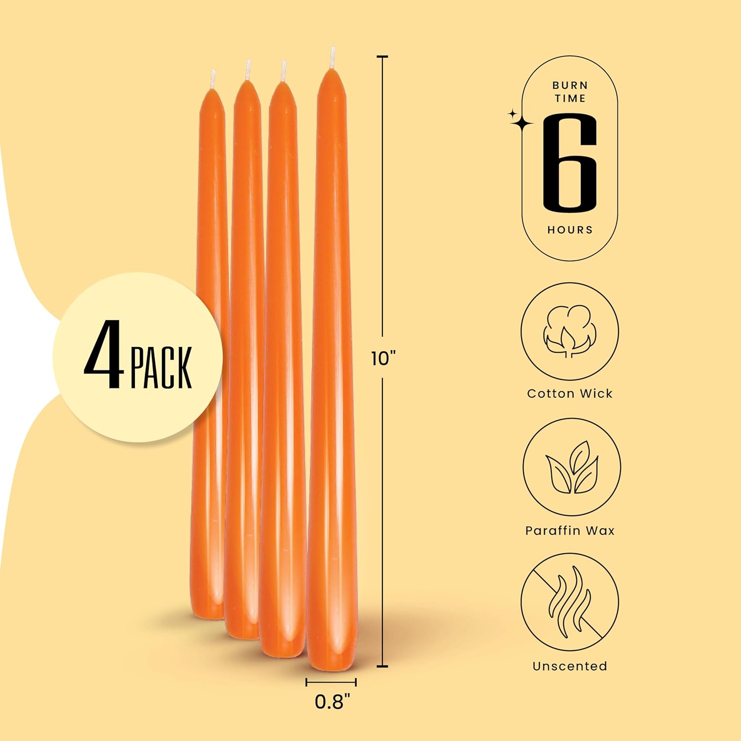 Leor & Lair Orange Taper Candles - 4 Pack 10" Orange Candlesticks - Unscented Long Burning Halloween Taper Candles for Halloween Decor, Thanksgiving Dinner, Fall Weddings & Restaurants