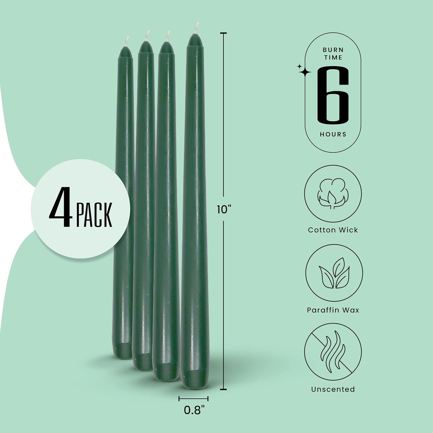 Leor & Lair Green Taper Candles - 4 Pack 10" Green Candlesticks for Christmas - Unscented Long Burning Candle Sticks for Spring, Home Decor, Dinner, Holidays, Weddings & Business Events