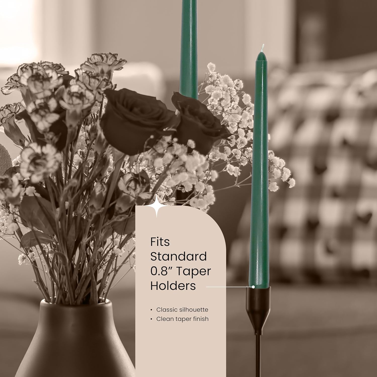 - Long-Burning Green Tapered Candles – Each 10” taper burns up to 6 hours unscented, providing steady light for Christmas tables, Easter brunches, or daily family dinners where dark green candle sticks add a touch of nature-inspired beauty.