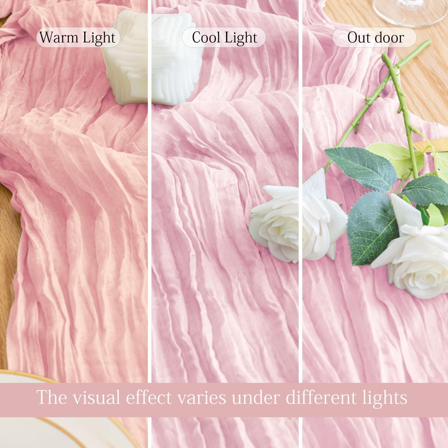 - 【Premium Material】The pink cheesecloth table runner is made of high-quality gauze fabric. Carefully sewn, delicate edge, not easy to lose thread, not easy to decolorize, lightweight and skin-friendly. They come twisted up, so when you unwrap them you can stretch and smooth them out as much as you'd like, or leave them more bunched and crinkly. These cheesecloth table runners compliment the floral arrangements & centrepieces without competing for space- the perfect textural addition and bring an upscale style to your decorations.