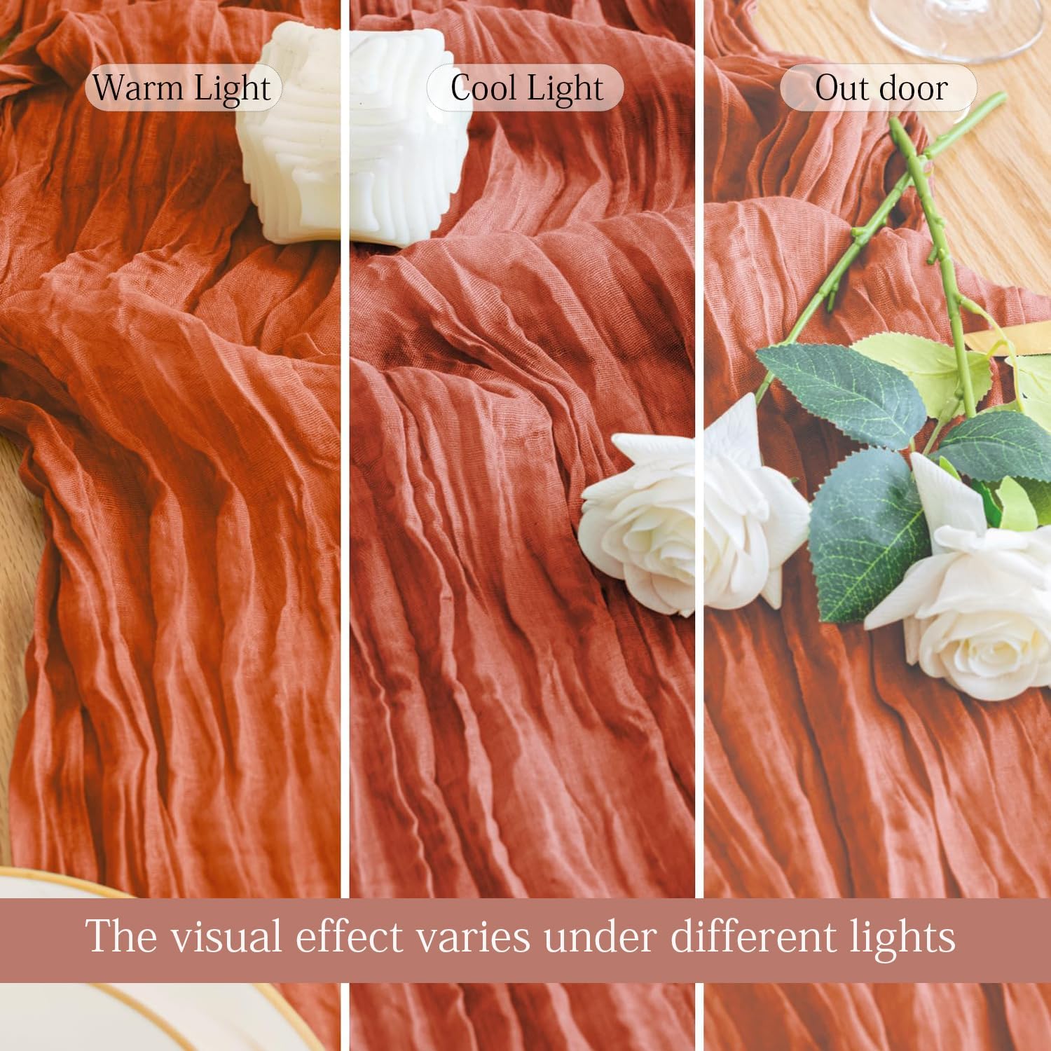 - 【Premium Material】The terracotta table runner is made of high-quality gauze fabric. Carefully sewn, delicate edge, not easy to lose thread, not easy to decolorize, lightweight and skin-friendly. They come twisted up, so when you unwrap them you can stretch and smooth them out as much as you'd like, or leave them more bunched and crinkly. These cheesecloth table runners compliment the floral arrangements & centrepieces without competing for space- the perfect textural addition and bring an upscale style to your decorations.