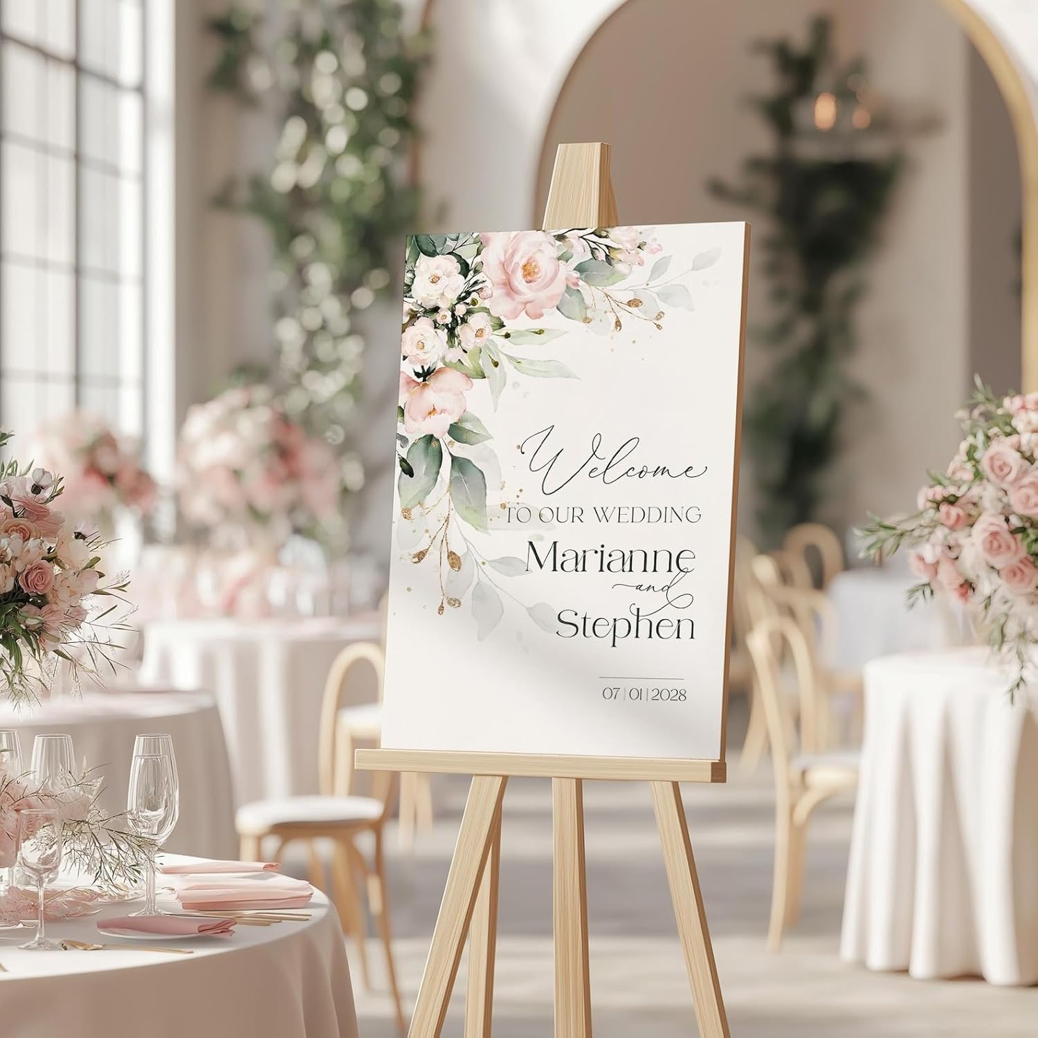 Personalized Wedding Welcome Sign, Blush Pink Floral Wedding Sign Signage 12" X 18" (Small), 27" (Medium), 36" (Large), Plastic, Modern, Pole Mount, Weather