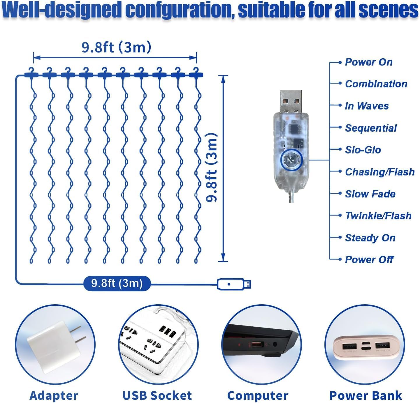 300LED Fairy Curtain Lights, 9.8x9.8Ft Warm White USB Plug in 8 Modes & Timer Christmas String Hanging Lights with Remote for Bedroom Indoor Outdoor Weddings Party Wall Decorations(White)
