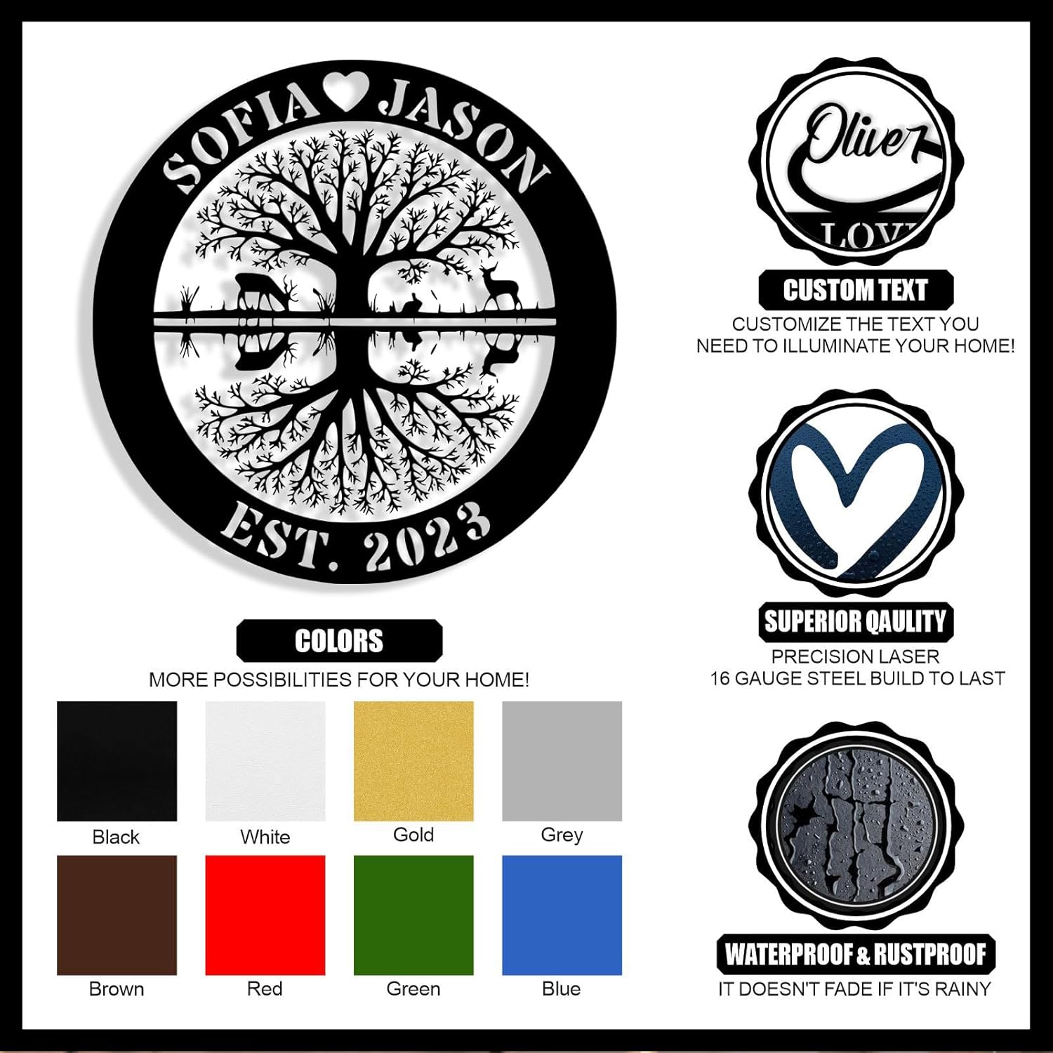 - Personalized & Name Customizable -- Click "CUSTOMIZE NOW" and enter the name or text. Our personalized Tree of Life Metal Sign designs make it unique, beautiful and elegant to create a perfect personalized family name sign for you. This custom last name sign is customized with your last name, first names and established date, will look beautiful indoor and outdoor any home.