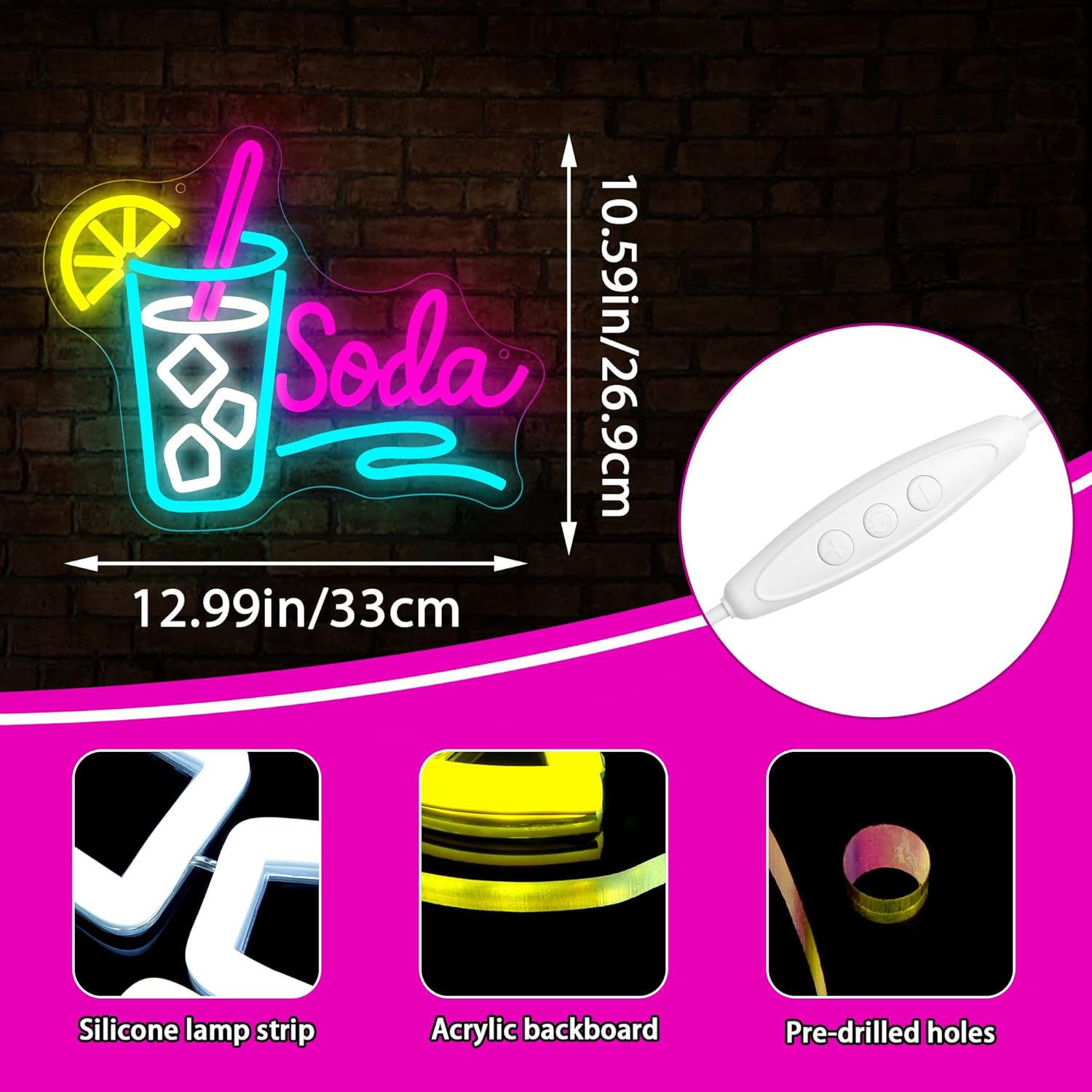 - Dimmable Neon: The soda pop neon sign has a dimmable 5V. It is equipped with a three button design of "-", "+", and "switch", making it easy to operate. The "-" key dims, the "+" key brightens, and the switch controls the start and stop.You can adjust the brightness according to your own needs or the actual scene to create the atmosphere you want.