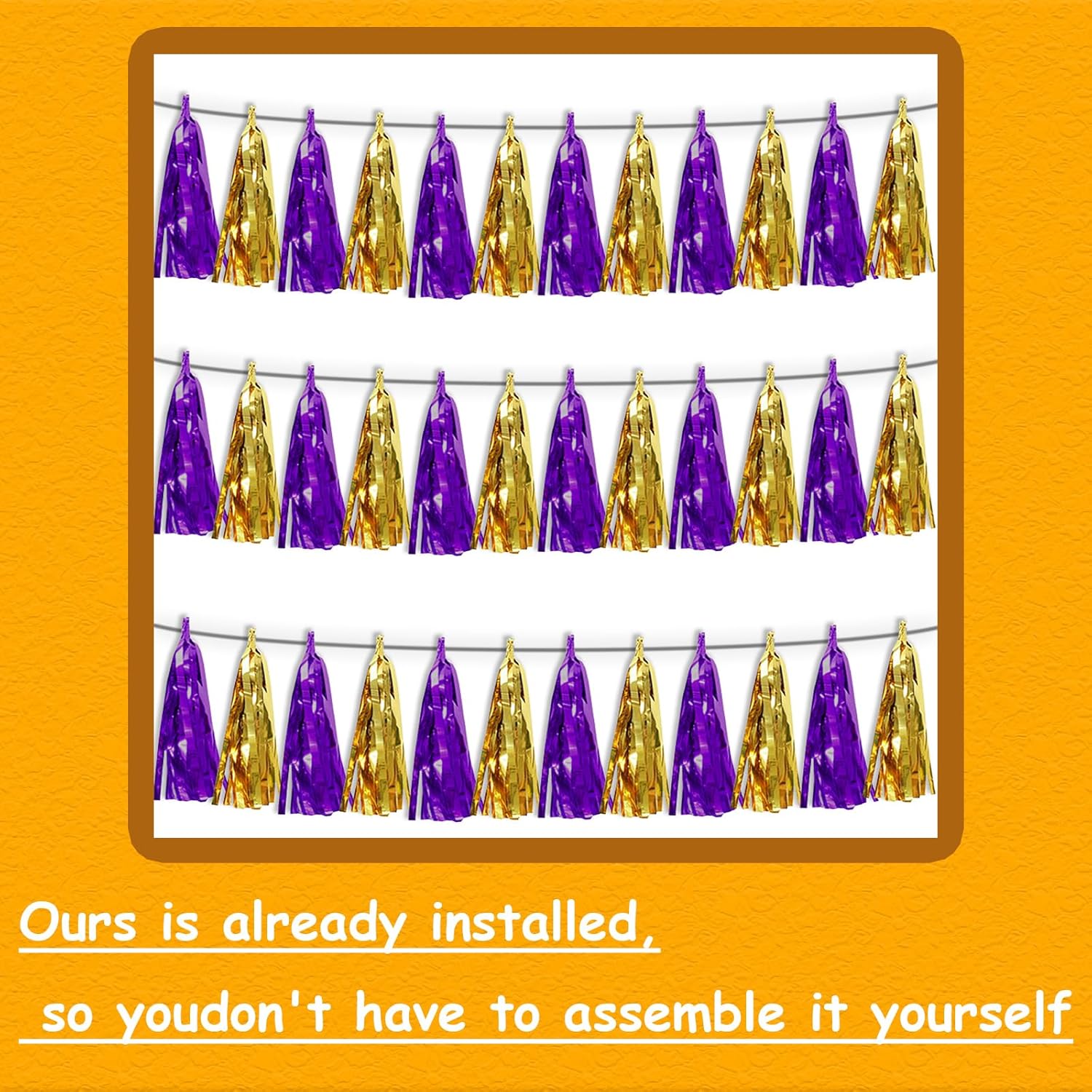 - 【Package Includes】The total length of them Purple Gold birthday tassels banner is 30 feet, divided into 3 strips, each 10 feet long. Each banner contains 15 tassels, and each tassel measures 14 inches, for birthday decorations many occasions uitable for Patriotic display, Homecoming Float, Christmas Float, ecorative metal trailers, graduation floats etc