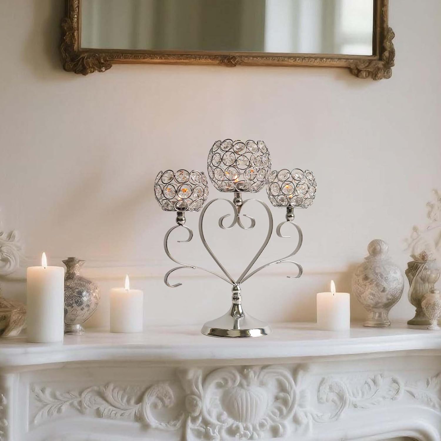 6 Pcs Silver 3-Arm Heart Tea Light Candle Holder - Crystal & Metal Wedding Centerpiece Decor, Sparkling Table Decor for Anniversaries/Romantic Tabletop Home/Dinner Party/Events